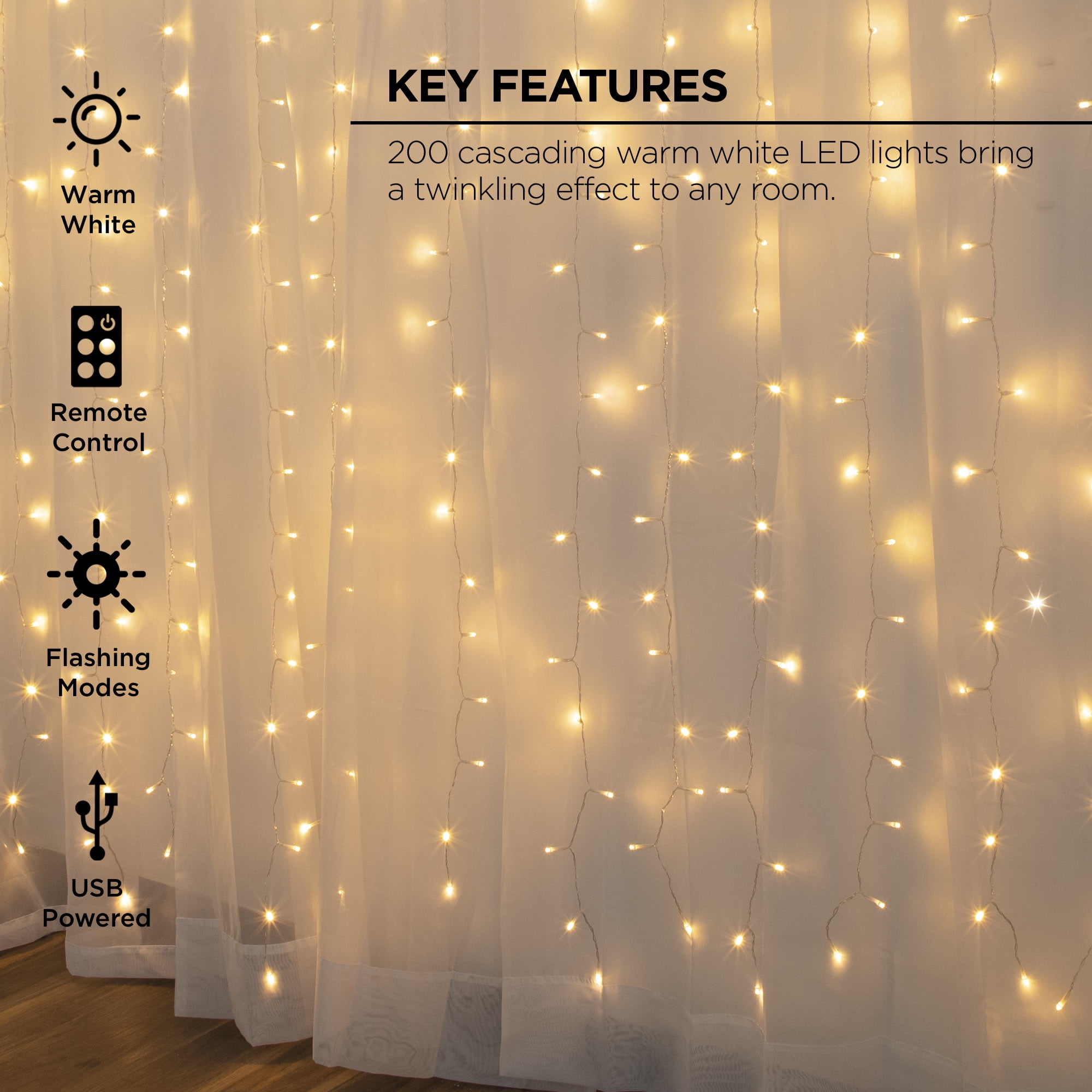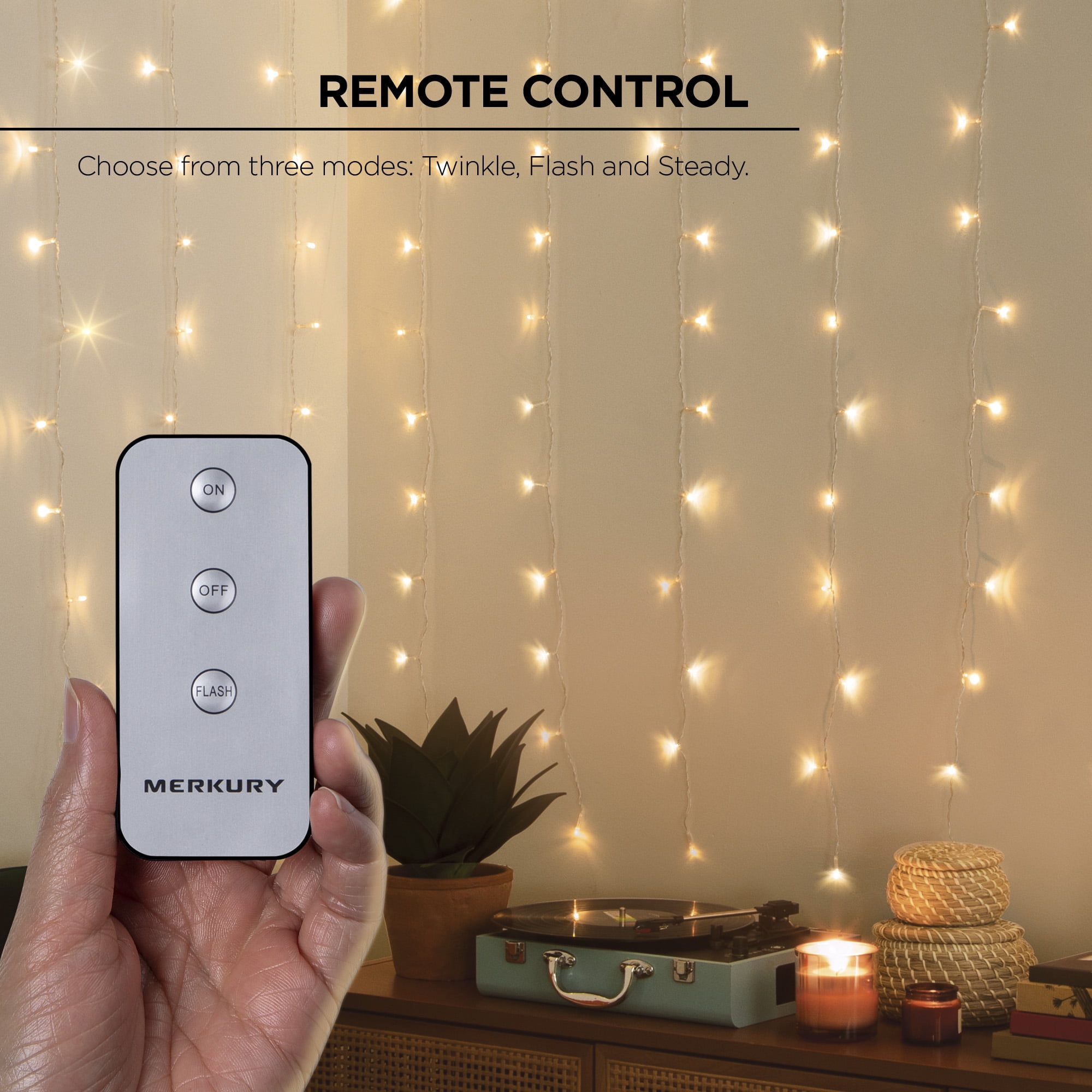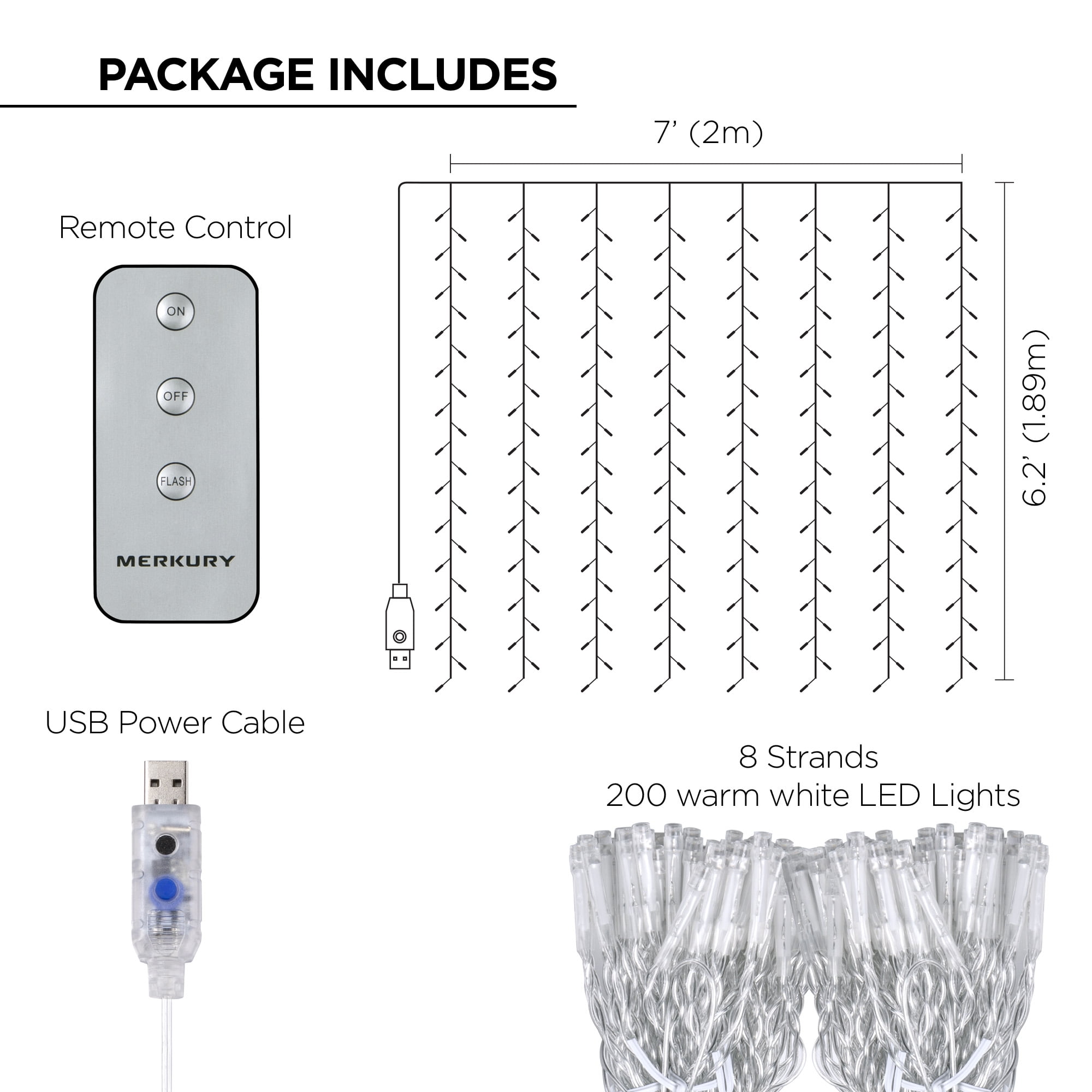 Perfect for bedrooms, living rooms, patios, decks and more. Enjoy the warm ambiance of these Merkury Innovations lights during gatherings, parties, while relaxing and more. Bring a warm white glow to your wall, curtains and more with cascading curtain lights! The 200 LED lights are arranged in 8 strands hanging from a connecting strand for easy hanging and a beautiful warm effect. The included remote allows you to power the curtain lights on and off and activate its flashing mode.