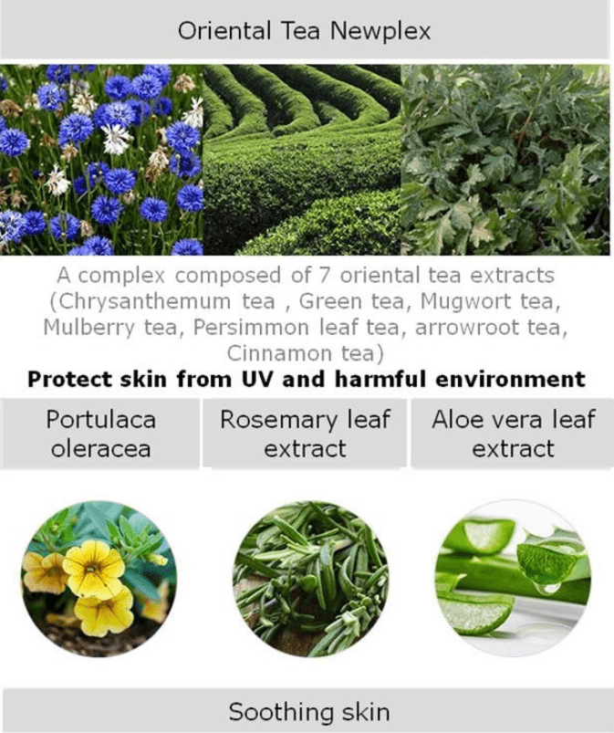 - KEY INGREDIENTS: Oriental Tea New plex: Comprised of 7 Asian tea extracts: green tea, chrysanthemum tea, mugwort tea, mulberry tea, persimmon leaf tea, arrowroot tea, cinnamon tea Protects skin from UV rays and other environmental stressors