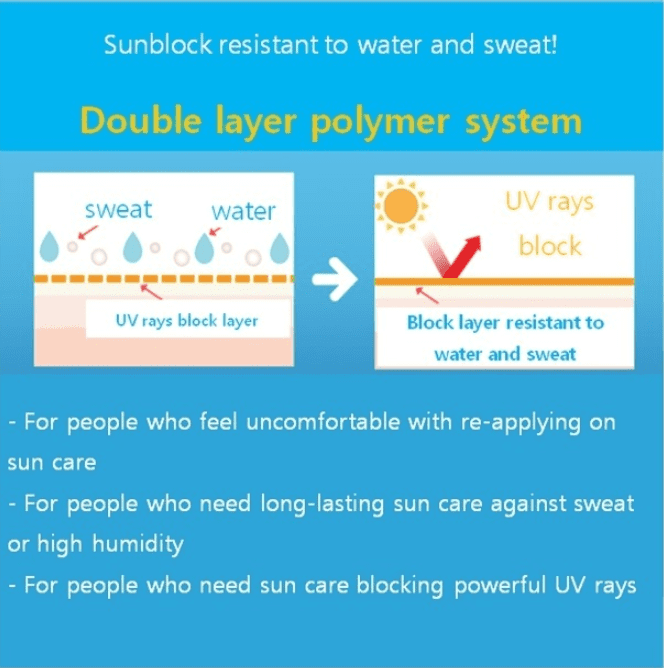 - Double Layer Polymer provides long-lasting, water and sweat-resistant UV protection