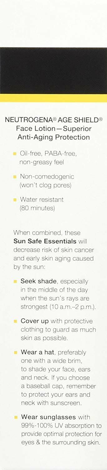 Age Shield Face Sunblock brings you superior balanced protection against both types of harmful rays with a true breakthrough in sunscreen technology. With Helioplex technology, Neutrogena Age Shield Face SPF 70 features a stabilizing complex that delivers superior, powerful and lasting protection across 100% of the UV spectrum, to withstand UV rays when others can break down. For deep cellular protection, the sheer formula in Neutrogena Age Shield Face SPF 70 contains a blend of powerful anti-oxidants to combat free radicals that accelerate the signs of aging. Maintain your youthful appearance with an advanced sunscreen solution from the #1 dermatologist recommended suncare that shields your skin 6 layers deep from skin-aging UVA rays. This product features Helioplex, a breadth of stabilized sunscreen technologies that delivers superior protection from the sun.