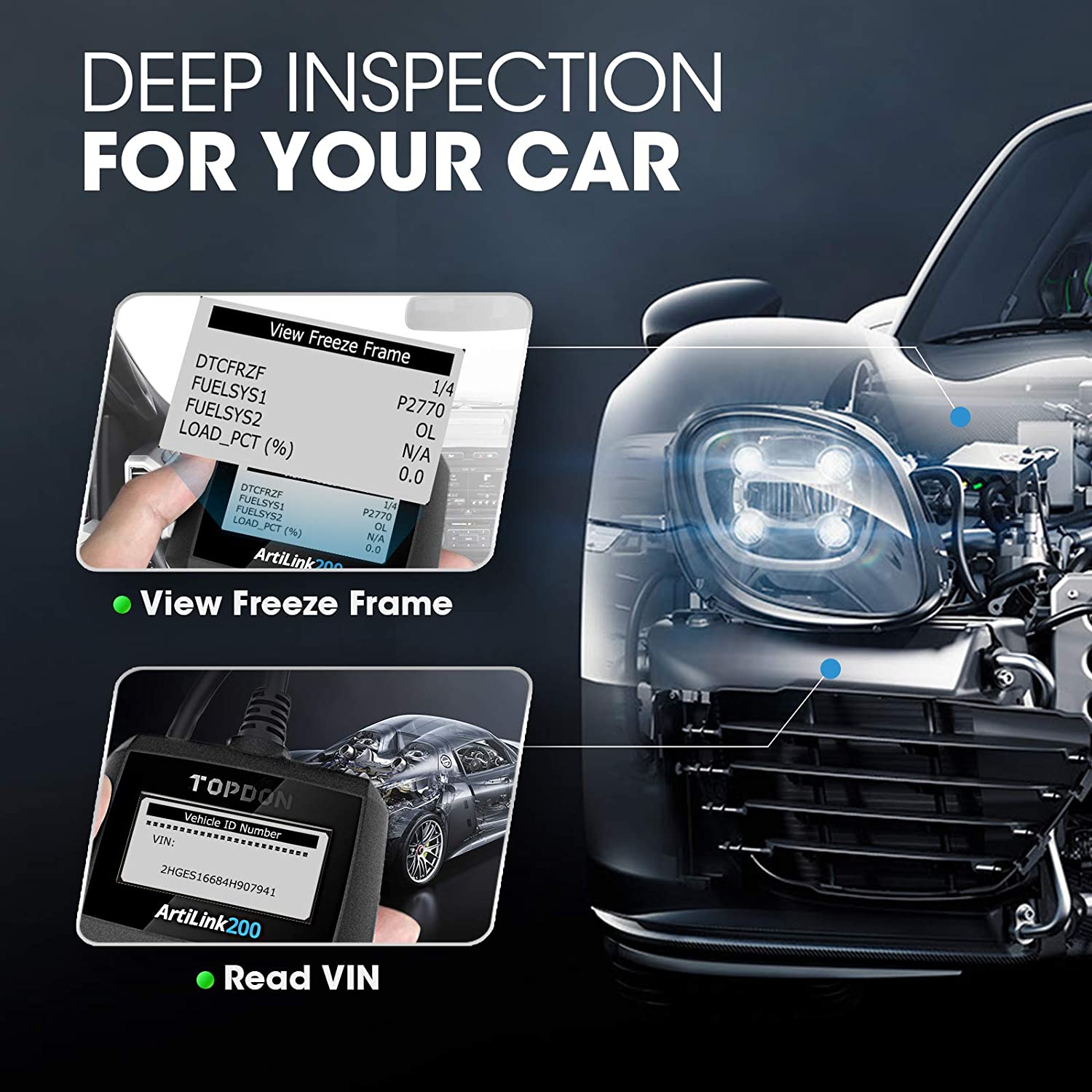 Information Retrieving – This helpful OBD2 scanner enables you to read freeze frame data recorded by the ECU When there are emission-related faults, helping Solve problems effectively. It also retrieves vehicle Info like Vin which is importantfor accurate vehicle problem diagnosis.