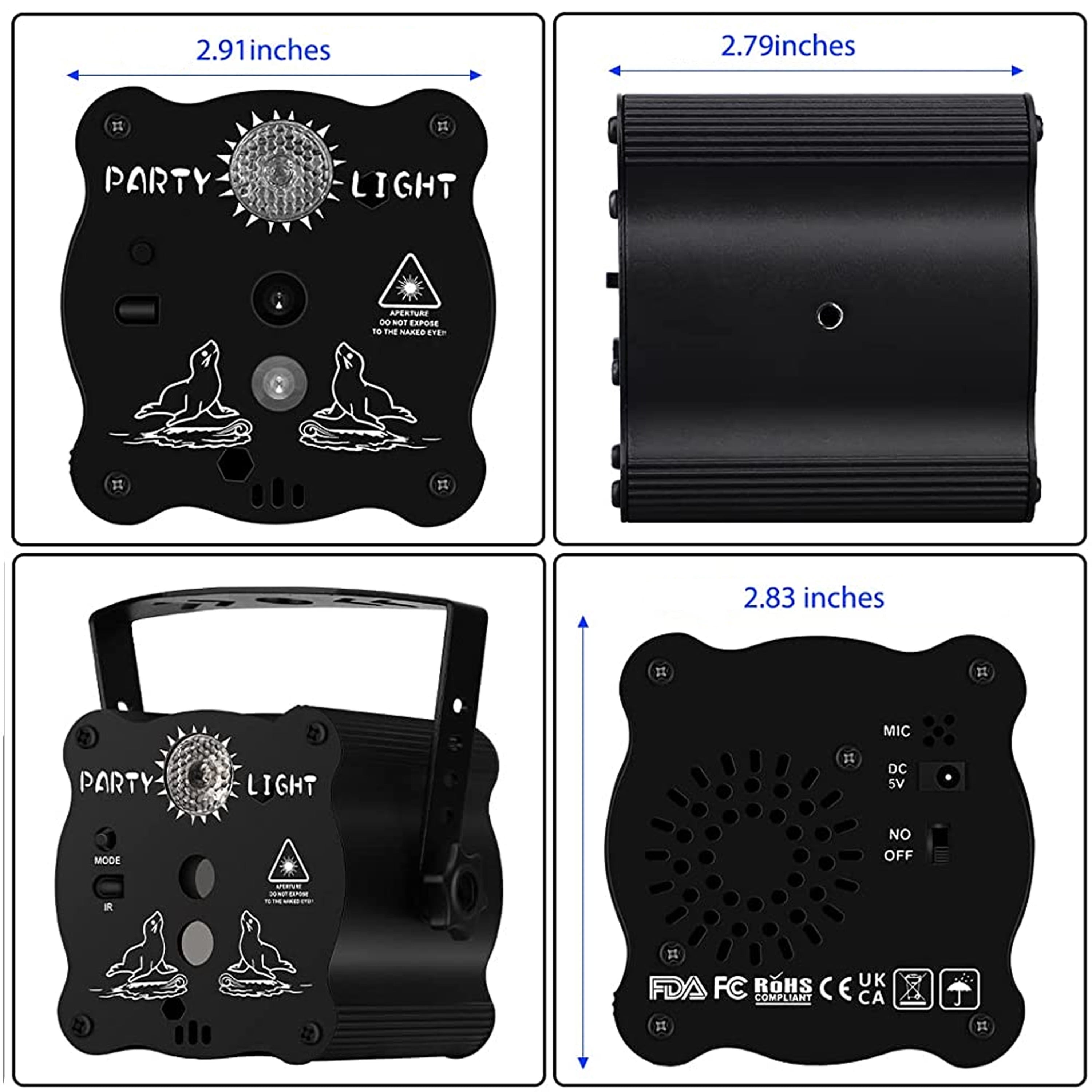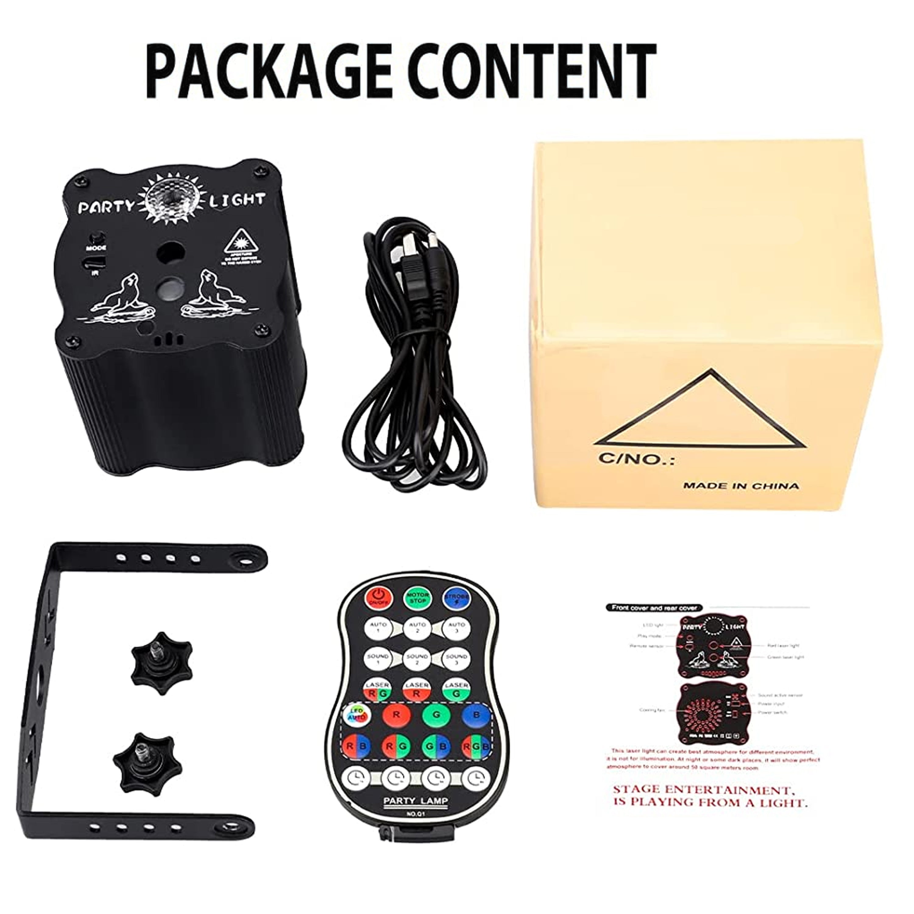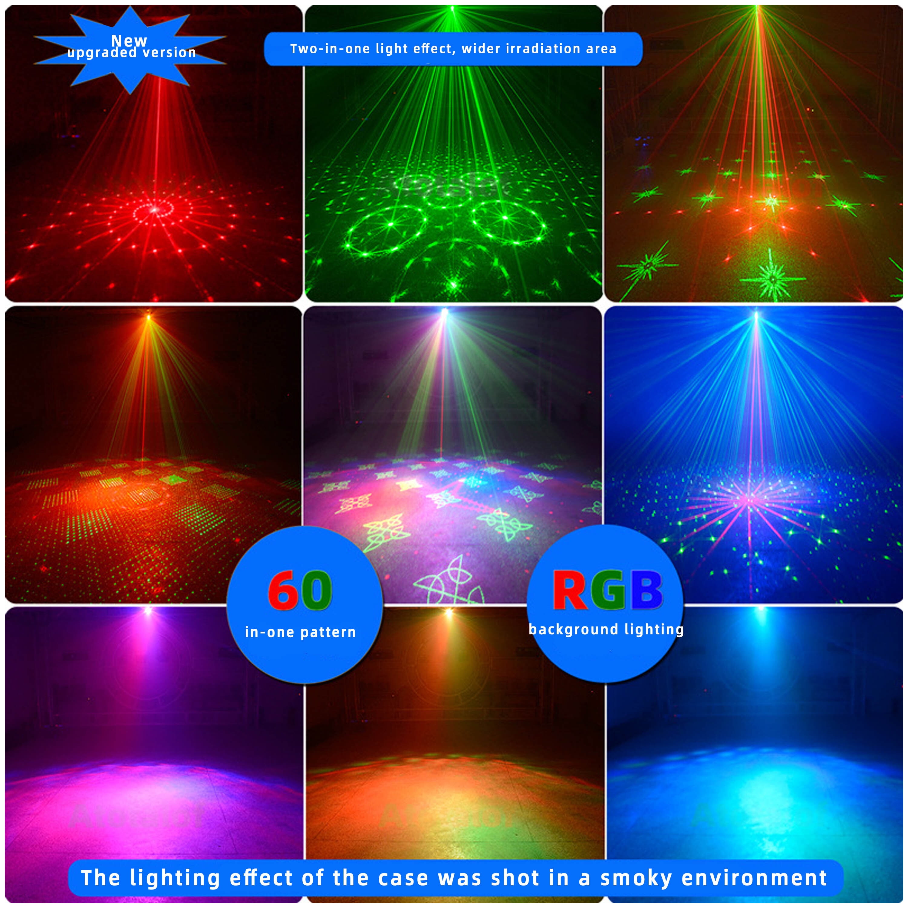 - Amazing Multi-effects:Upgraded version disco lights for parties, capable of producing 60 combinations of images, 6 color backgrounds (red, green, blue, red & green, red & blue, blue & green) and 3 beam combinations (green, red, green & red), creating a more wonderful stage atmosphere with multi-effect and high definition projection quality combination