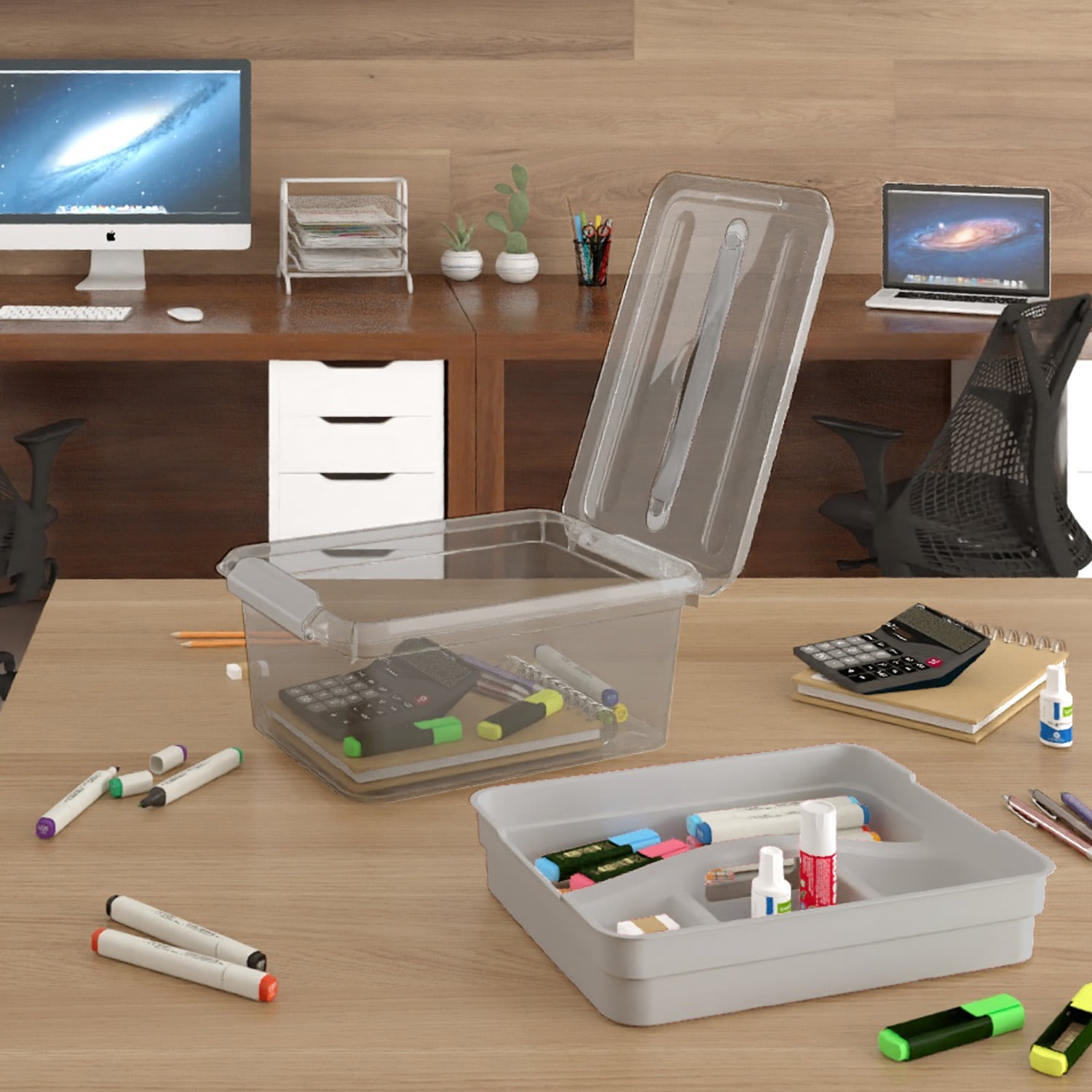 The PEN+GEAR Latch mate Series helps keep you organized while saving you space. The latches on this PEN+GEAR Latch mate are attached to the base allowing a secure closure and can act as a hinge. It has a lift-out accessory tray that keeps small items organized and easy to find. This stackable container has reinforced corners that resist against damage and the gliders on the bottom offer more secure stacking and easy gliding of units. This polypropylene container is available in a 14.5-qt size that has a clear bottom so you can easily view the contents inside. Each one measures 16.00" x 11.10" x 7.00" so it can easily be stored. Perfect for home, office, or school!
