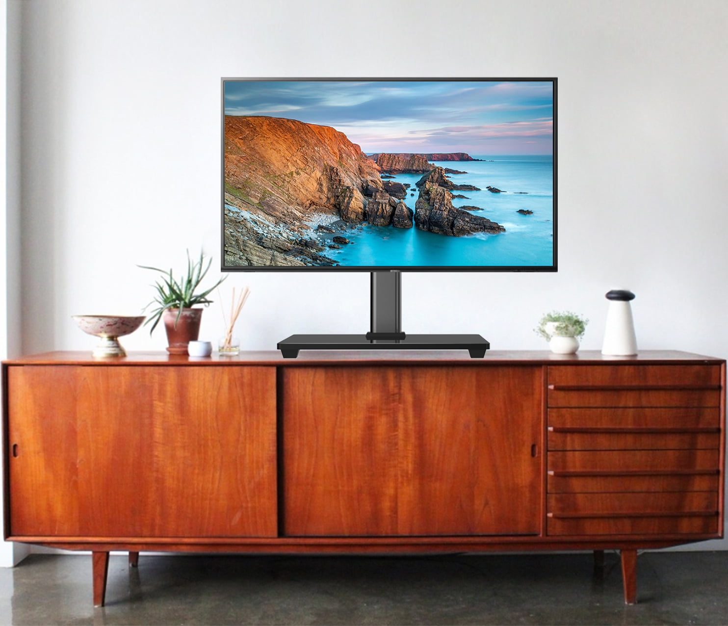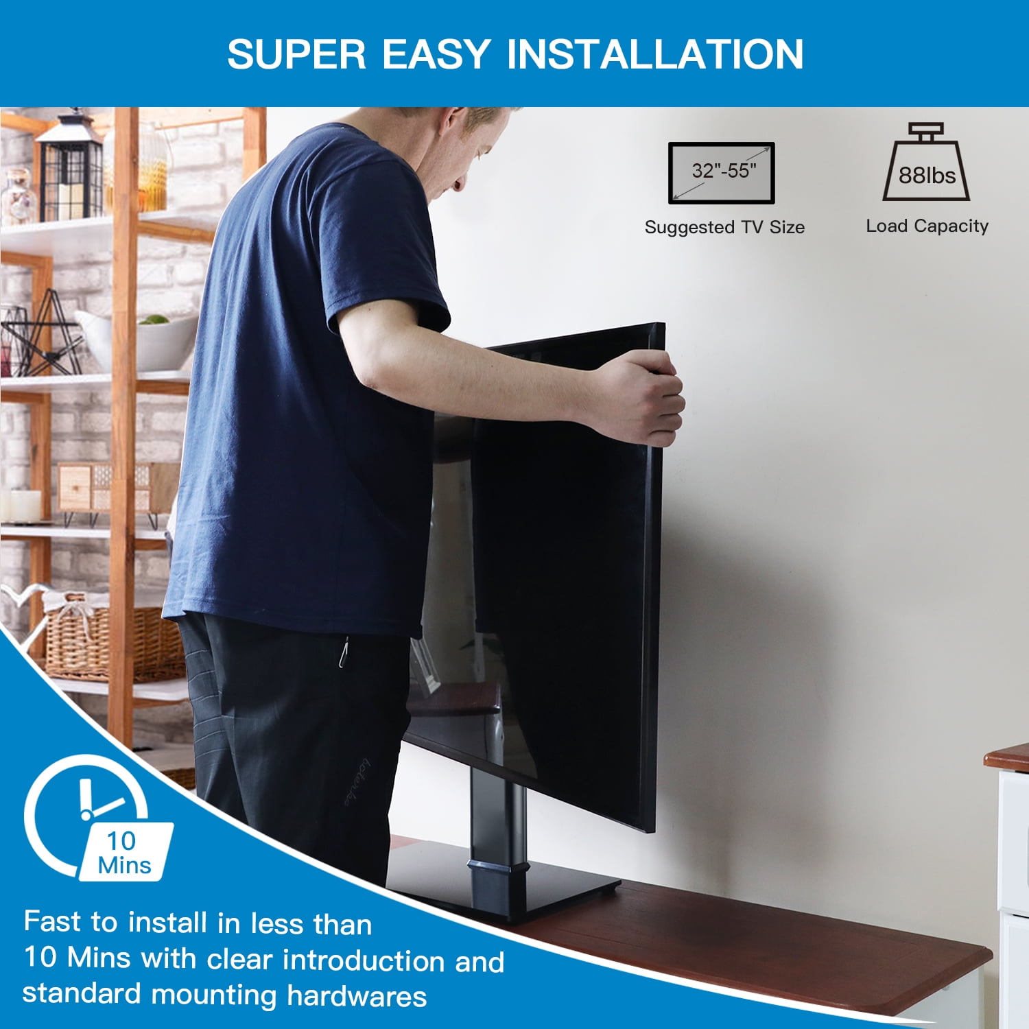 This swivel tabletop TV stands conveniently swivel TV ± 30° by hand to meet a variety of different viewing needs and requirements. Choose the best viewing position from anywhere in the room. Easy installation within 15 mins. Simply follow our easy-to-use instructional manual and videos. Comes with height adjustment ranging from 8 in to suit different applications or TV sizes. This tabletop TV stand will save your mounting fee and avoid wall damage. Super easy to install and have it up in running in less than 15 minutes. Move anywhere conveniently, perfect for engineering, function, and great directions.
