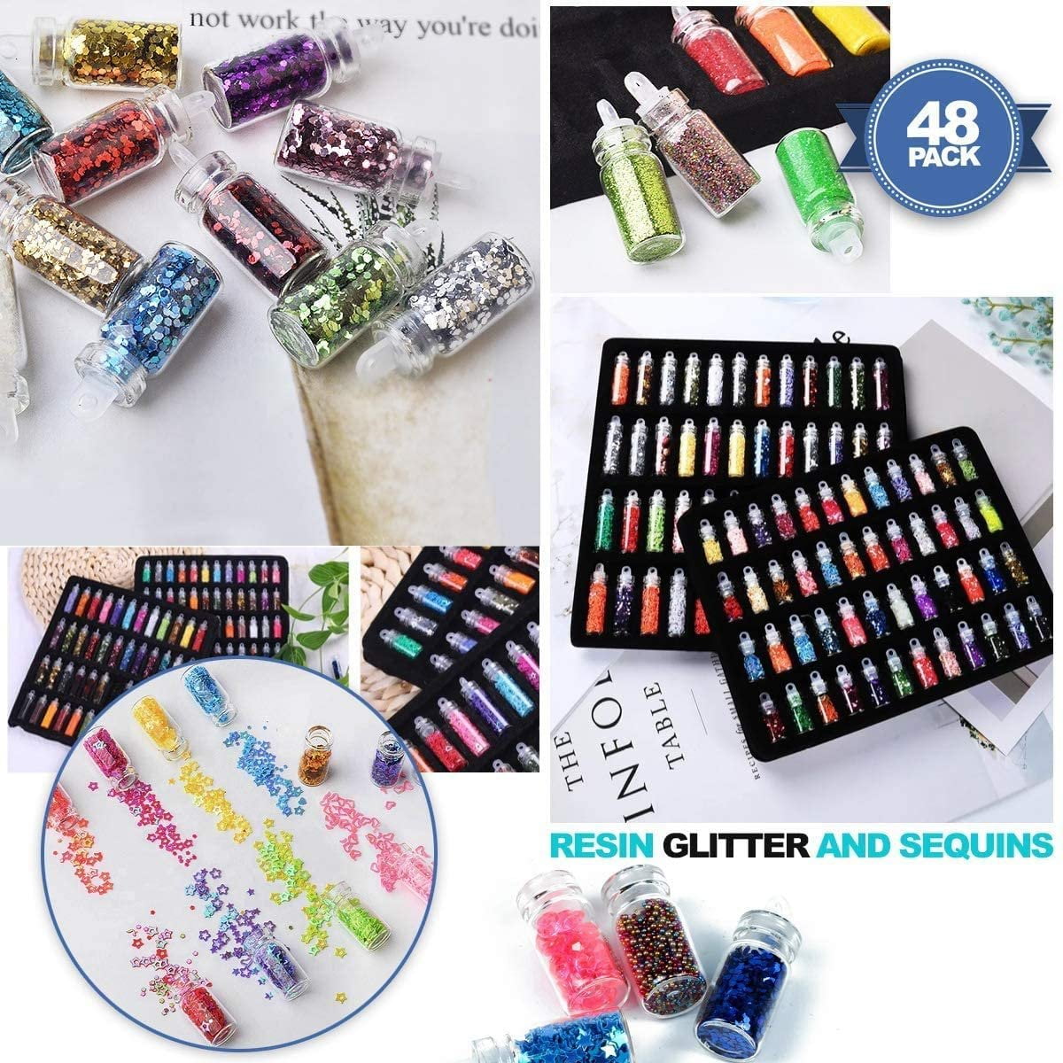 - ULTRA FINE GLITTER & SEQUINS FOR TUMBLERS – 48 bottles of tumbler glitter and sequins in different colors, shapes and sizes. The perfect accessory for your glitter epoxy tumblers and resin coaster tiles.