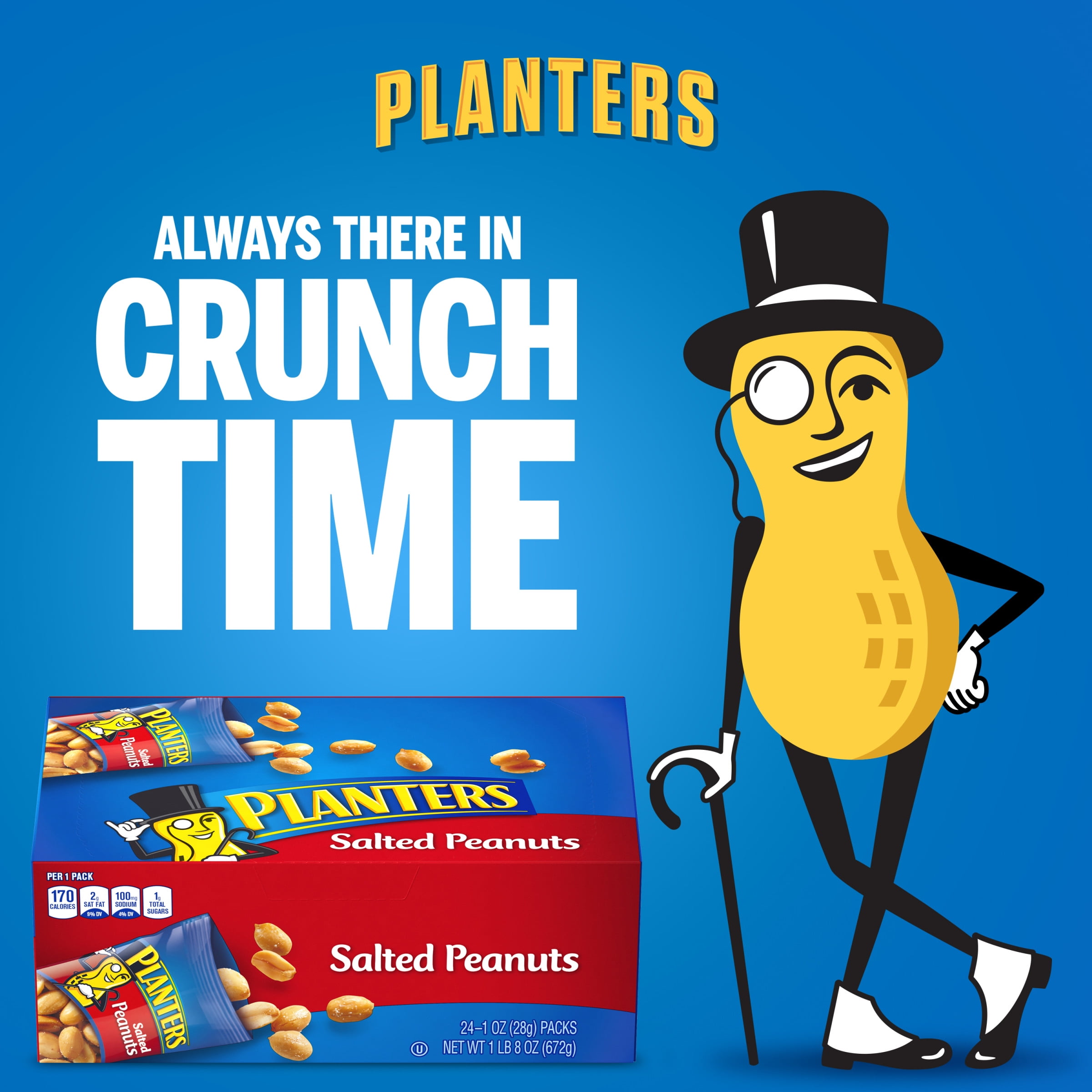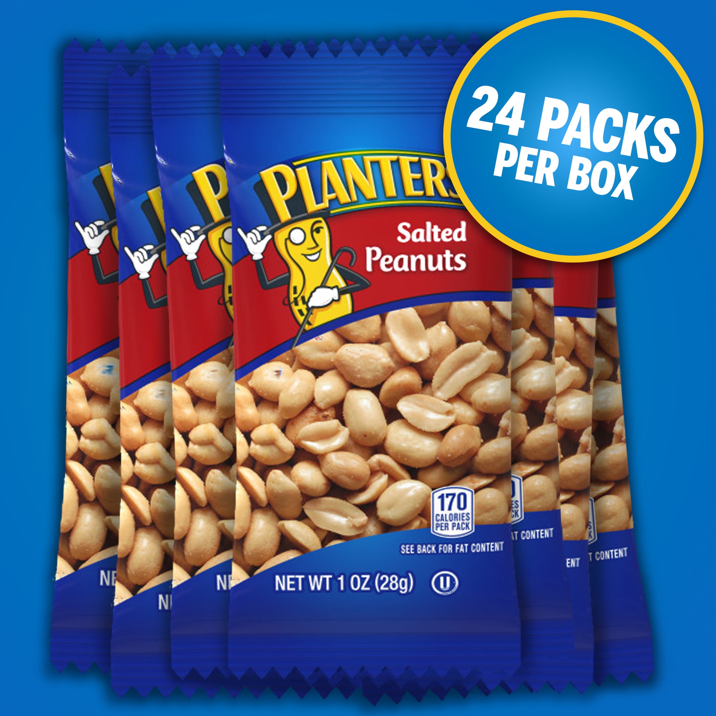 Planters Salted Peanuts follow the original Planters recipe everyone knows and loves. With a legendary taste and satisfying crunch, these peanuts are made with only three simple ingredients: peanuts, peanut oil and sea salt. Each peanut is finely seasoned with sea salt to enhance the natural roasted nut flavor. These perfectly roasted peanuts have 7 grams of protein and are a good source of vitamin E. Free of cholesterol and trans-fat, Planter’s peanuts have 14 grams of fat per serving are the perfect on-the-go salty snack. Enjoy the traditional taste and crunch of a handful of roasted nuts. This 24 count box of peanuts are a great snack for those keeping Kosher and each 1 ounce pack is ideal for on-the-go snacking.