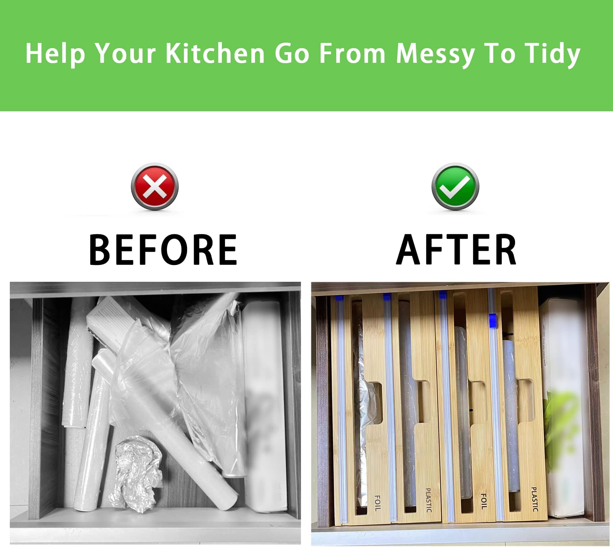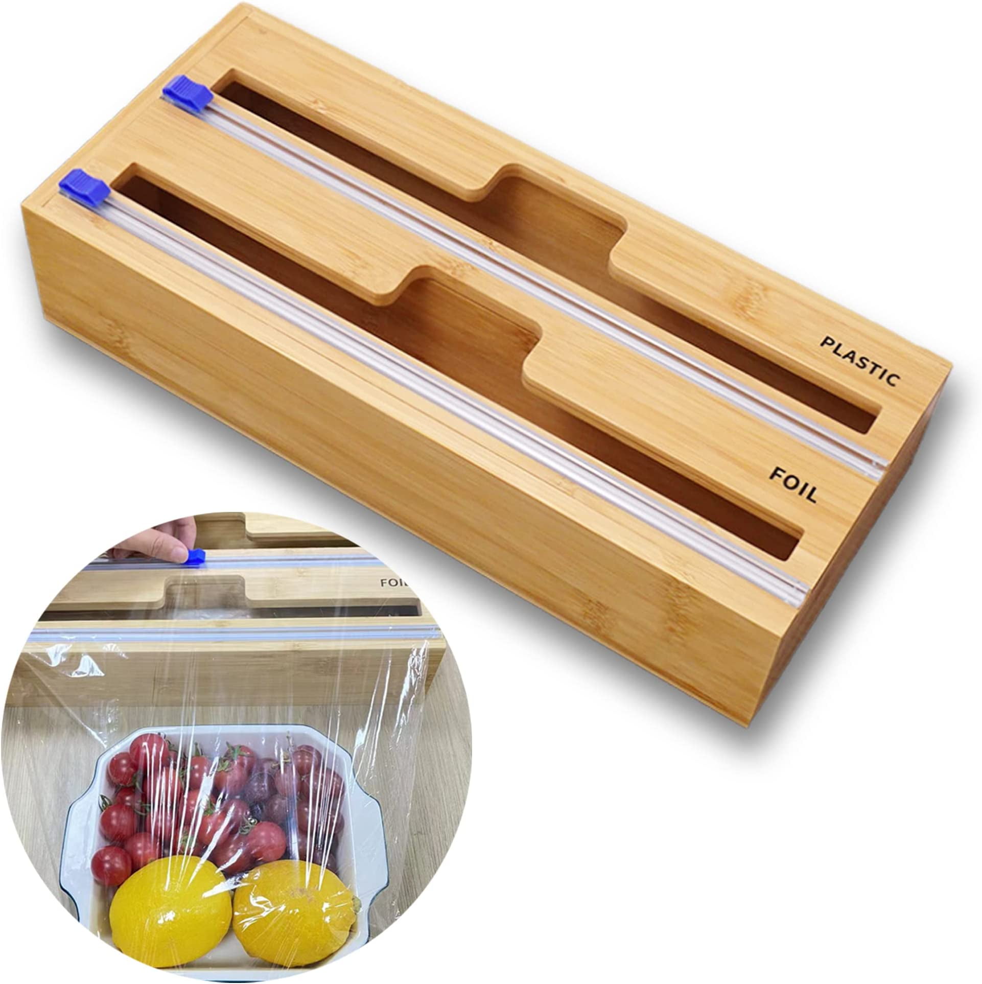 This wraps organizer offers you different ways of organizing plastic wraps. You can put it in drawer or hang it on the wall. Bigger opening in the middle makes it easier to find the roll start.Ziplock Bag Organizer, Happiwiz Plastic Wrap Dispenser with Cutter, Wrap Aluminum Foil and Wax Paper Dispenser for Kitchen Drawer, Bamboo Roll Organizer Holder, Compatible with 12" Roll