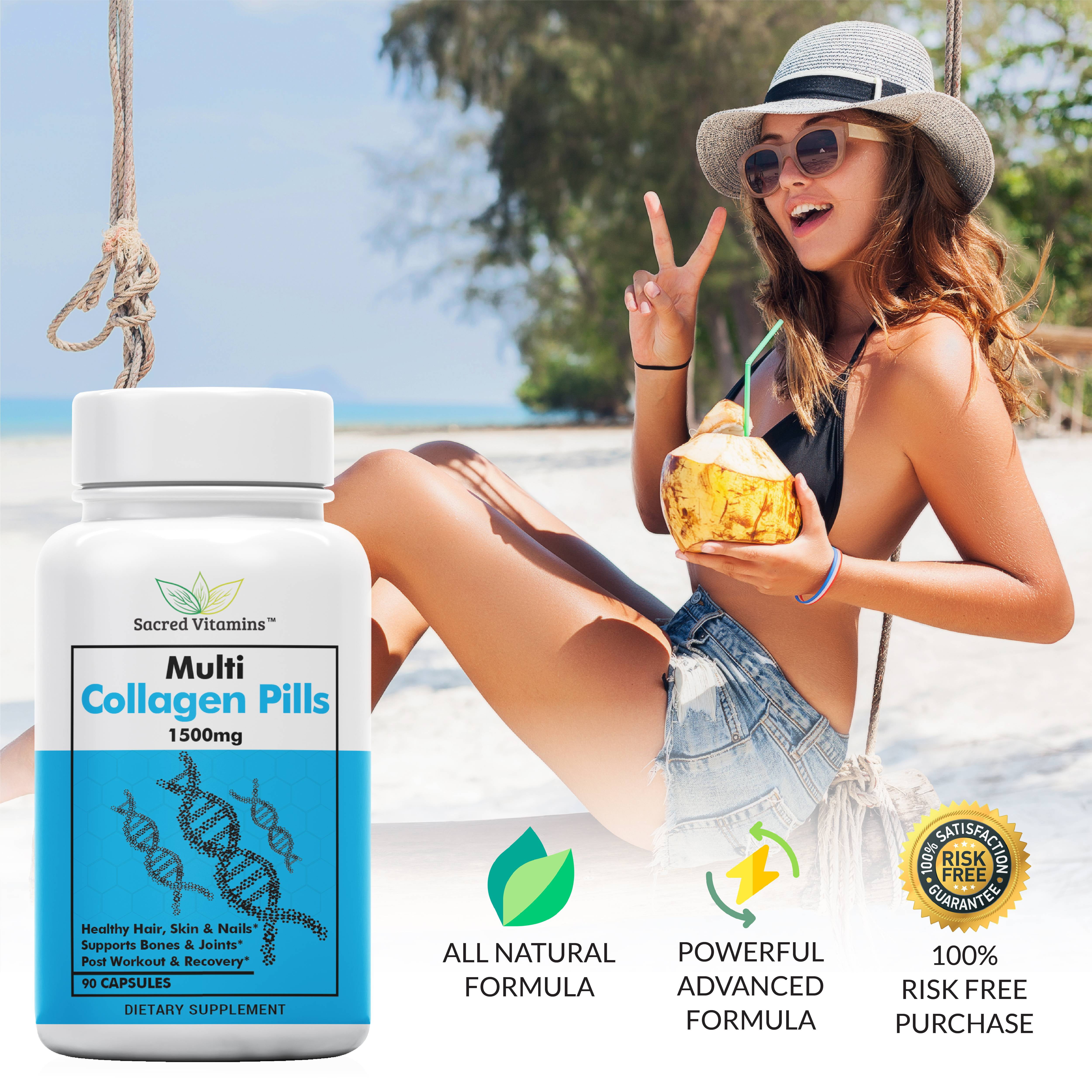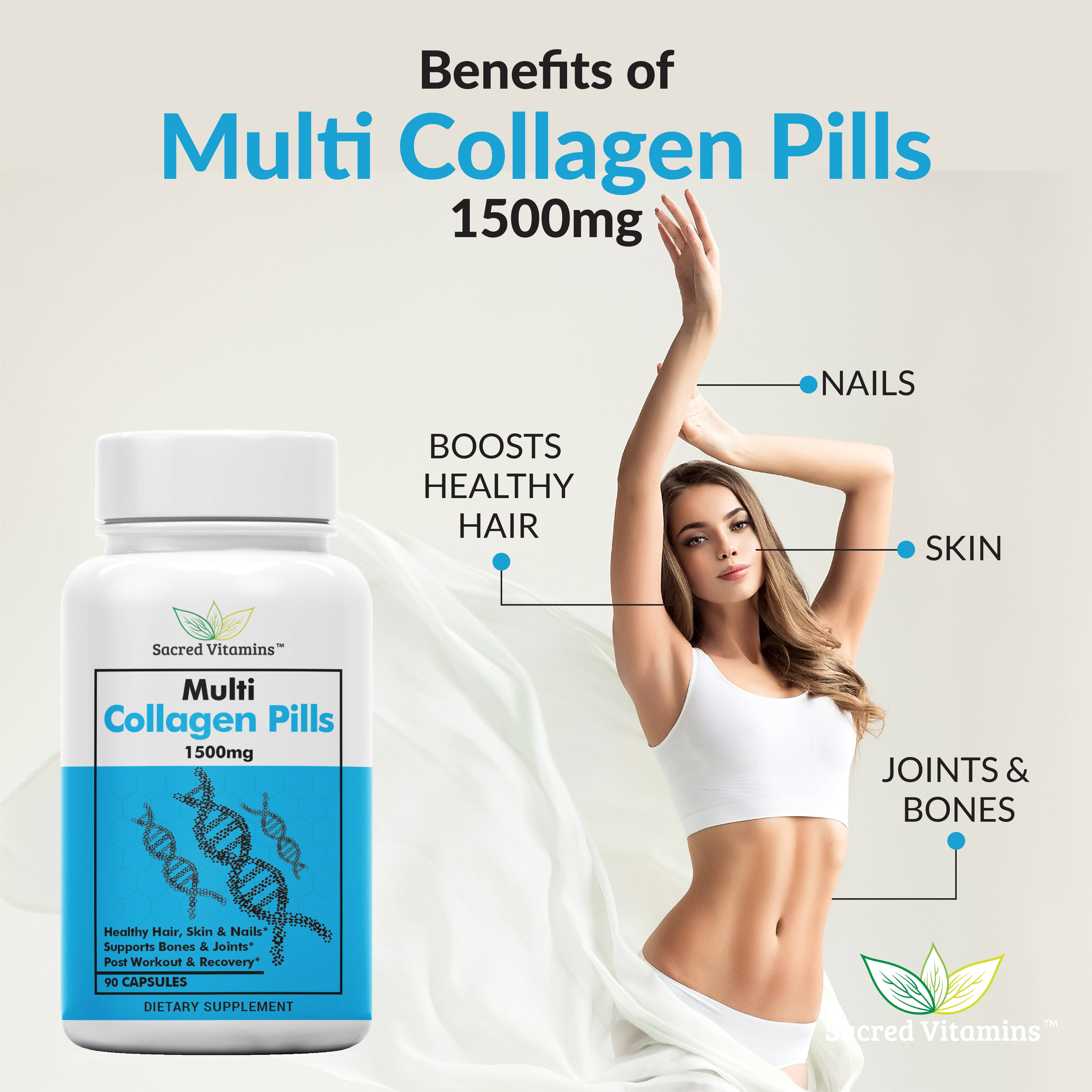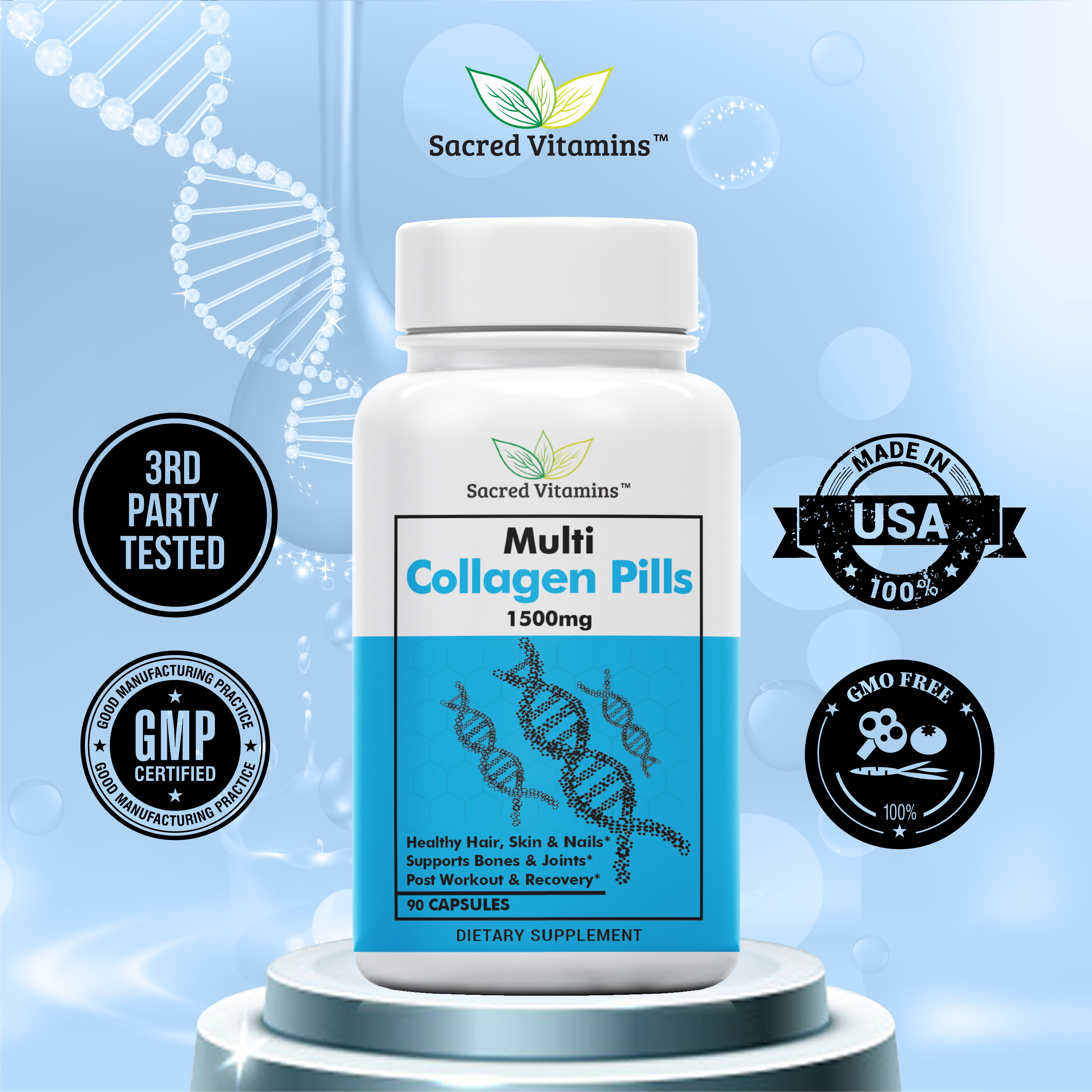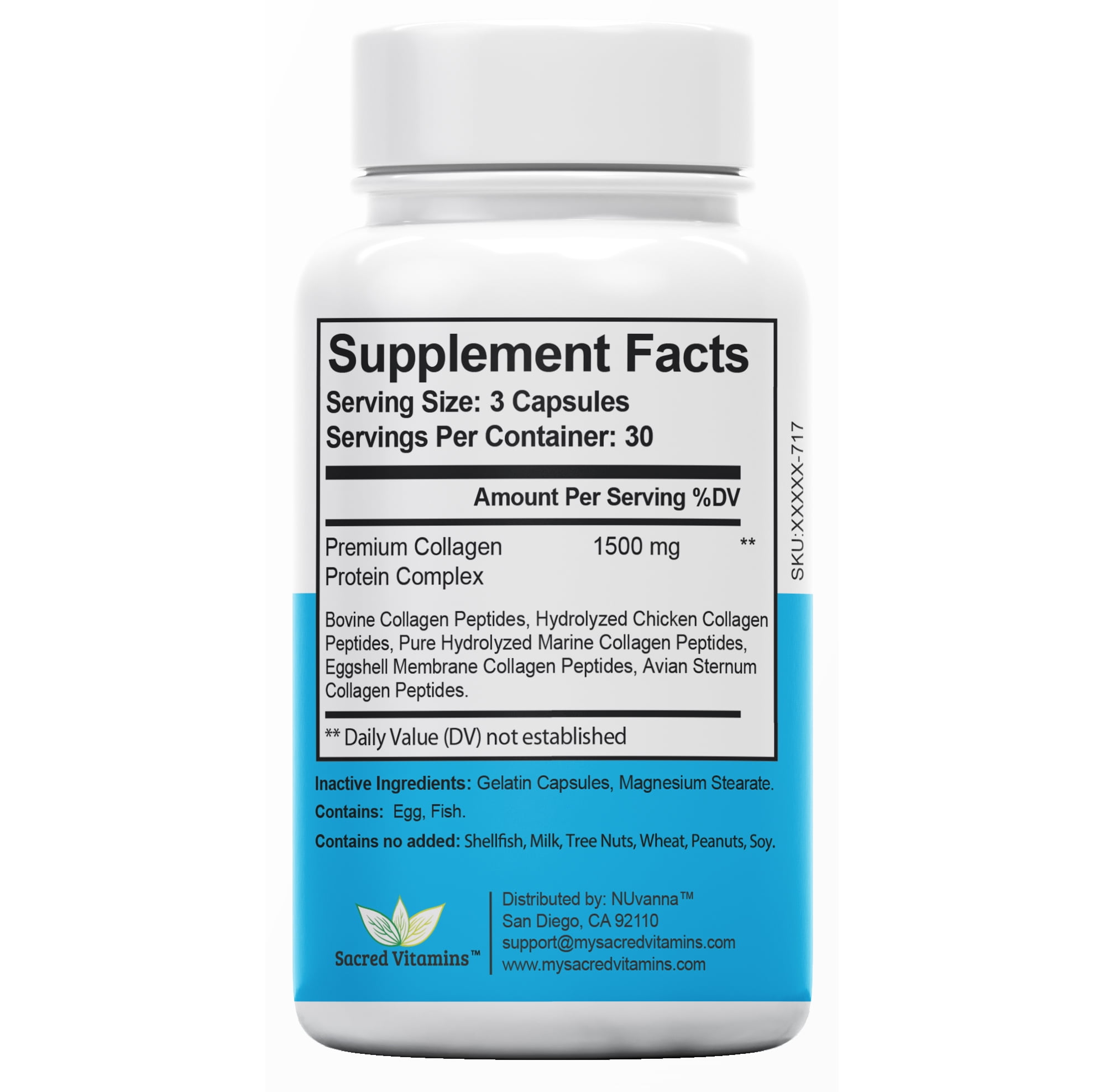 The Ultimate Multi-Collagen Complex for Year-Round Support!Our specially blended bone and joint health supplement are formulated with only pure collagen peptides, from bovine collagen peptides to hydrolyzed collagen peptides, we aim on delivering all the amazing health benefits of collagen to your entire body!Our complete collagen protein complex will enable your body to absorb and utilize all the benefits the best hair nail and skin vitamins have to offer. As an innovator in the collagen and biotin space, our formula for women and men gets to work fast and protects your bones and joints from future ailments.4 AMAZING BENEFITS OF COLLAGEN:- Radiant Hair, Skin, and Nails*- Joint Support*- Strengthens Bones*- Promotes Healthy Skin*Don’t rely on trendy hair growth supplements and gross powders that are made with preservatives and fillers! We at Sacred Vitamins have developed a natural collagen complex for optimal performance, helping you feel your best when you need it most.Get your Health and Mind on the Right Track with Sacred Vitamins Complete Collagen Capsules!