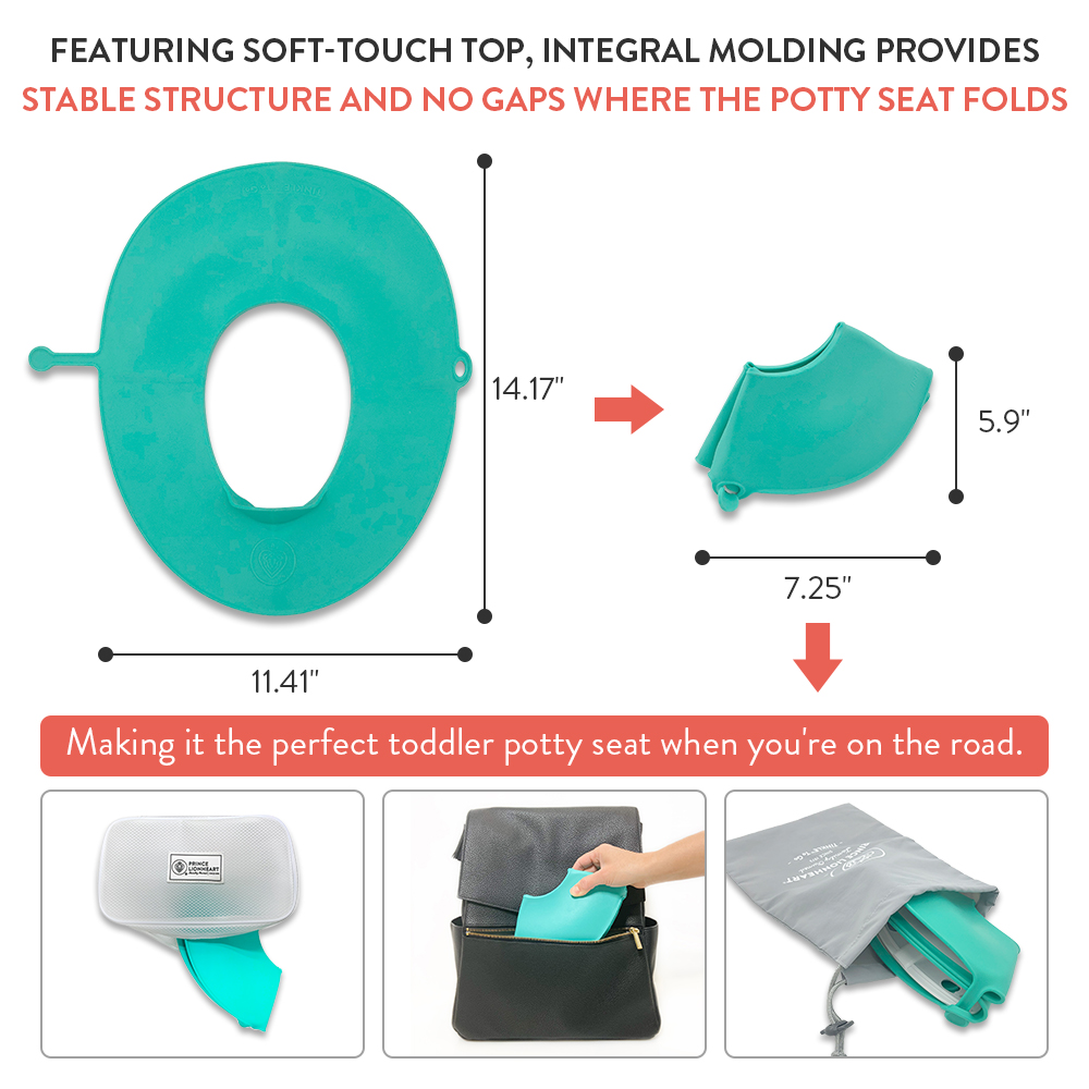 This kids toilet seat attachment fits most standard and public toilets and measures 14.17" x 11.41" x 0.98". It also folds into a compact 7.28" x 5.90" x 1.96", making it the perfect toddler potty seat when you’re on the road. Simply fold the toddler toilet seat and toss it in the pouch for use anywhere.