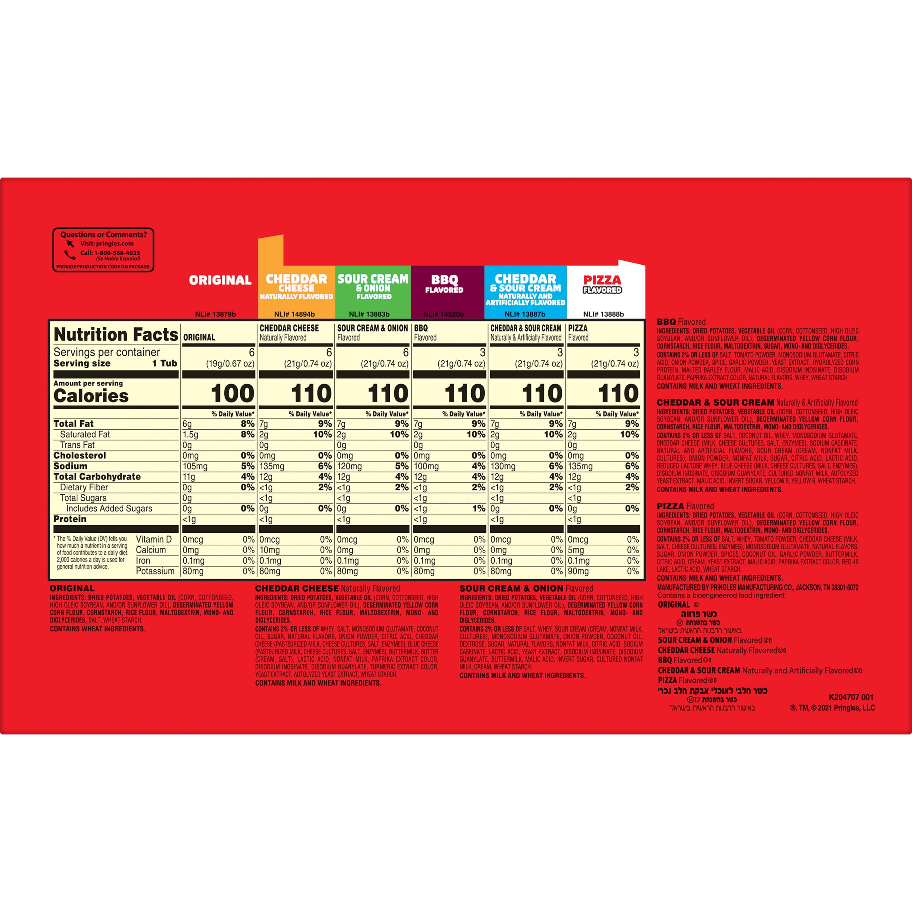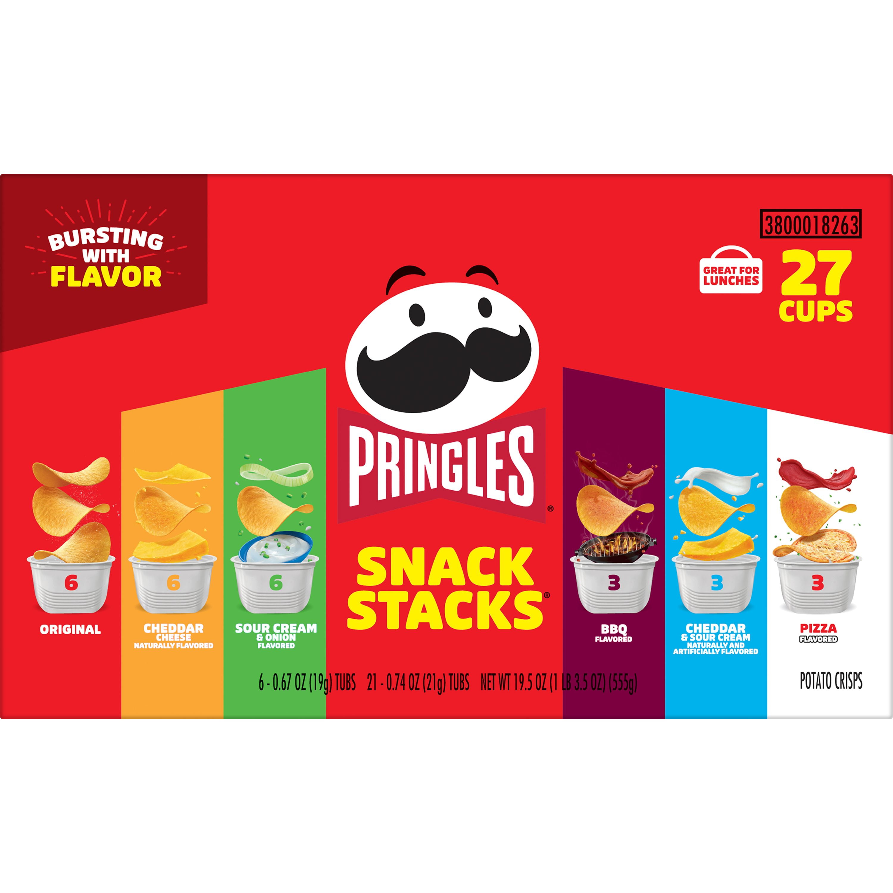 - Includes one, 19.5-ounce box containing six Original, six Cheddar Cheese, six Sour Cream and Onion, three BBQ, three Cheddar and Sour Cream, and three Pizza Pringles cups