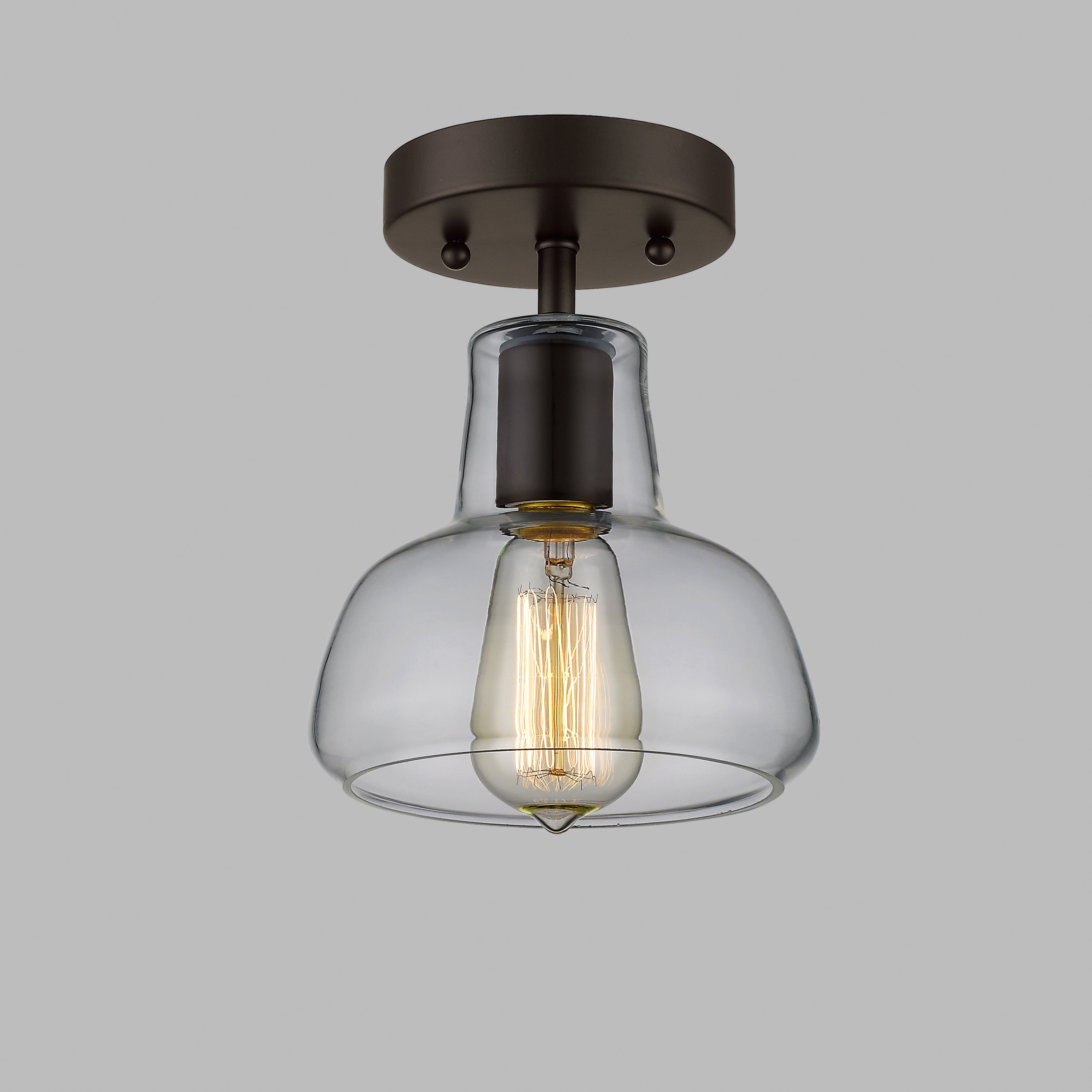 This 1-light semi flush mount features oil rubbed bronze finish that will complement many loft, urban, industrial and transitional decors. The unique shape of the clear glass shade adds interest and showcases the old fashioned 60w Edison bulb included. Dry listed and recommended indoor use only.