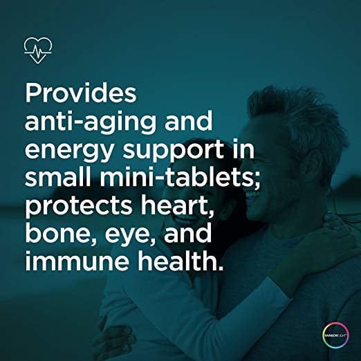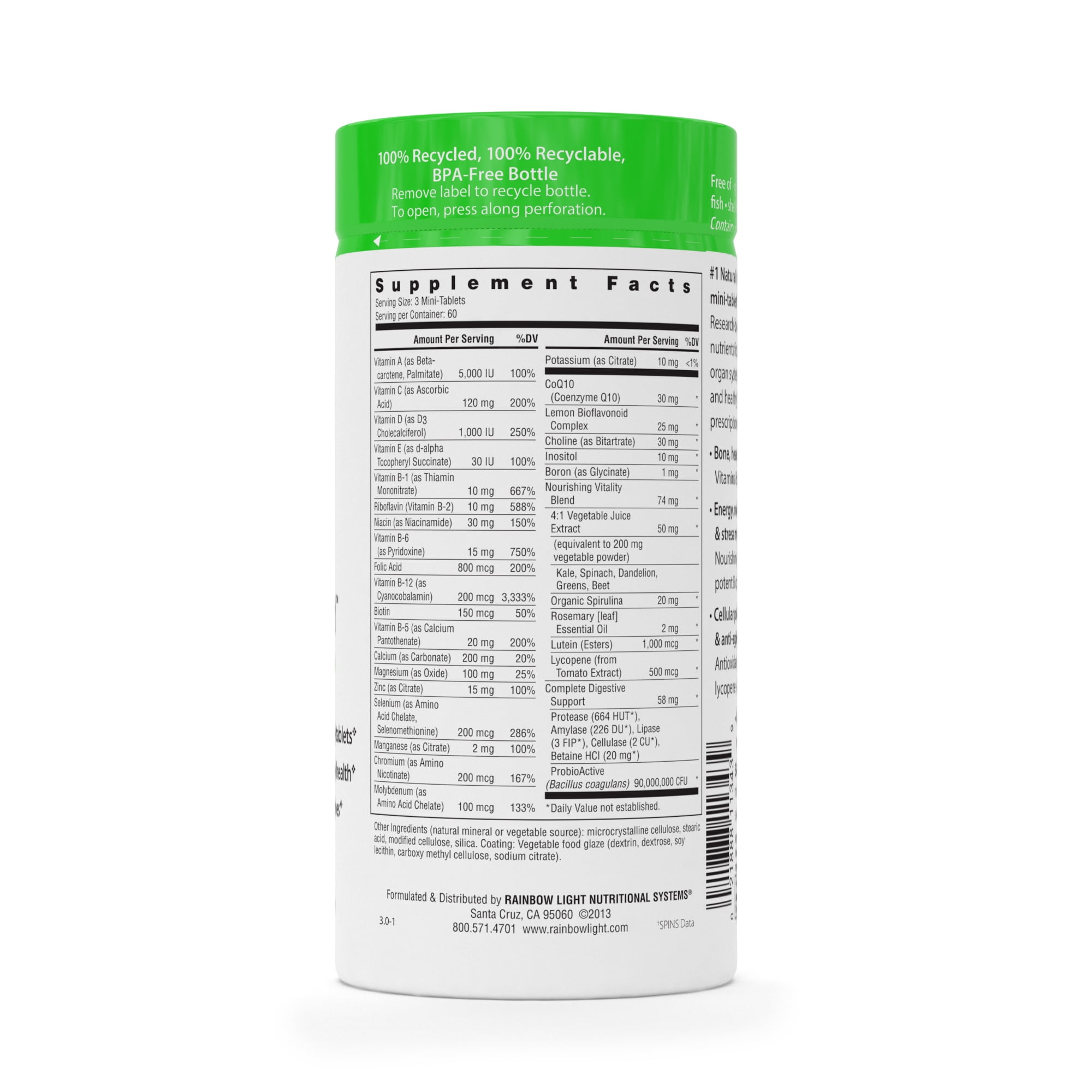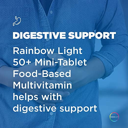 Rainbow Light 50+ Mini-Tablet Multivitamin provides essential vitamins, minerals, antioxidants, and foods to naturally nourish and protect mature, active adults throughout the day. Three easy-to-swallow mini-tablets per day provide multivitamin protection to address the specific health needs of adults over 50 with vitamin D, a potent B-complex, Co Q-10, extra antioxidant protection, and probiotics and plant-sourced enzymes to support overall digestive health. This supplement provides powerful protection that mature bodies need throughout the day. Co Q-10, lutein, lycopene, selenium, Vitamin A, Vitamin C and zinc support immune, heart, eye, skin, and prostate health and help promote cell growth, function, and maintenance A potent vitamin B-complex promotes metabolism of energy from food and supports stress management. In addition, 1,000 IU of vitamin D3 promotes calcium absorption for strong bones and teeth. Nourishing Vitality Blend, includes organic spirulina superfood and concentrated kale, beet, and spinach juices, providing added nutrition for natural energy and to promote enhanced absorption and digestion of co-nutrients. A custom blend of plant-source enzymes and 90 million CFU of shelf-stable probiotics (healthy bacteria) enhances digestion without taxing your system or causing stomach upset.