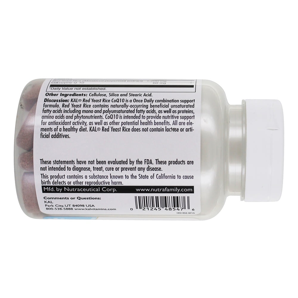 KAL Red Yeast Rice CoQ10 is a Once Daily combination support formula. Red Yeast Rice contains naturally-occurring beneficial unsaturated fatty acids including mono and polyunsaturated fatty acids, as well as proteins, amino acids and phytonutrients. CoQ10 is intended to provide nutritive support for antioxidant activity, as well as other potential health benefits. All are elements of a healthy diet. KAL Red Yeast Rice does not contain lactose or artificial additives.Red Yeast Rice CoQ10 Once Daily by Kal 30 Tablet Red Yeast Rice CoQ10 Once Daily 30 Tablet KAL Red Yeast Rice CoQ10 is a Once Daily combination support formula. Red Yeast Rice contains naturally-occurring beneficial unsaturated fatty acids including mono and polyunsaturated fatty acids as well as proteins amino acids and phytonutrients. CoQ10 is intended to provide nutritive support for antioxidant activity as well as other potential health benefits. All are elements of a healthy diet. KAL Red Yeast Rice does not contain lactose or artificial additives. Suggested Use As a dietary supplement Use only as directed. Take 1 tablet daily with a meal or glass of water. Store in a cool dry place. – Or as directed by your healthcare professional. Supplement Facts Serving Size 1 Servings Per Container 30 Amount Per Serving Daily Value Red Yeast Rice (Monascus purpureas) (extract) 1 200 mg CoEnzyme Q-10 60 mg Percent Daily Values are based on a 2 000 calorie diet Other Ingredients Silica and Ste