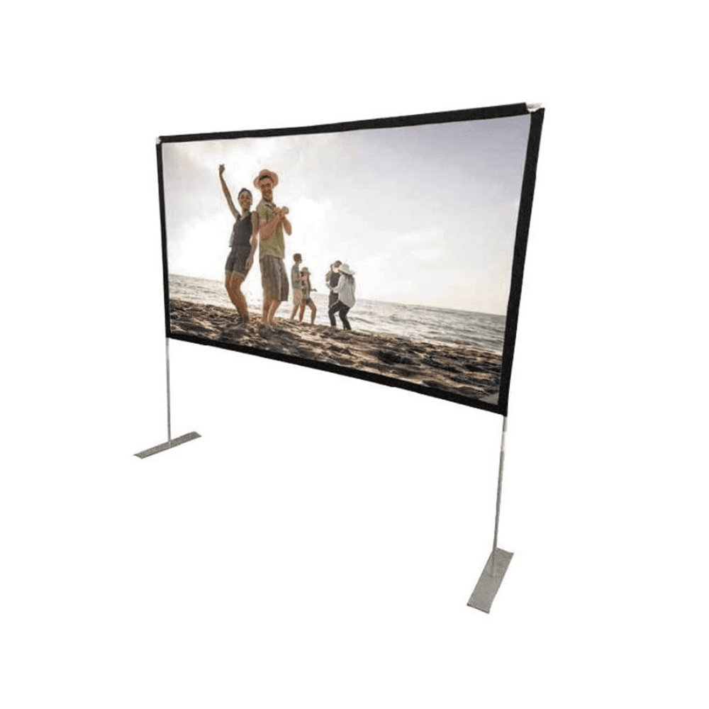 Enjoy a big screen cinematic experience in your backyard or at the campsite with the RCA outdoor theater screen. This 100-inch front-projection screen supports a 16:9 aspect ratio and uses durable material that can withstand the elements and remain outside 24/7. It sets up easily and includes stakes for stabilization. Huge 100" home projection screen.4K Ultra HD and HDR (high dynamic range) ready.Portable design for easy and fast set up/teardown both indoors and outdoors.Heavy-duty frame construction and screen works in all weather conditions.16:9 wide screen aspect ratio.160-degree viewing angle delivers viewing from nearly all angles.Super white 1.1 gain white matte all weather screen.Viewing screen size: 51.5" high x 86.5” wide.Overall size: 55" high x 90.5” wide.Fully tensioned screen ensures a smooth projection surface.Black masking material enhances picture contrast.Includes Carrying case and stakes to secure the screen for outdoor viewing.