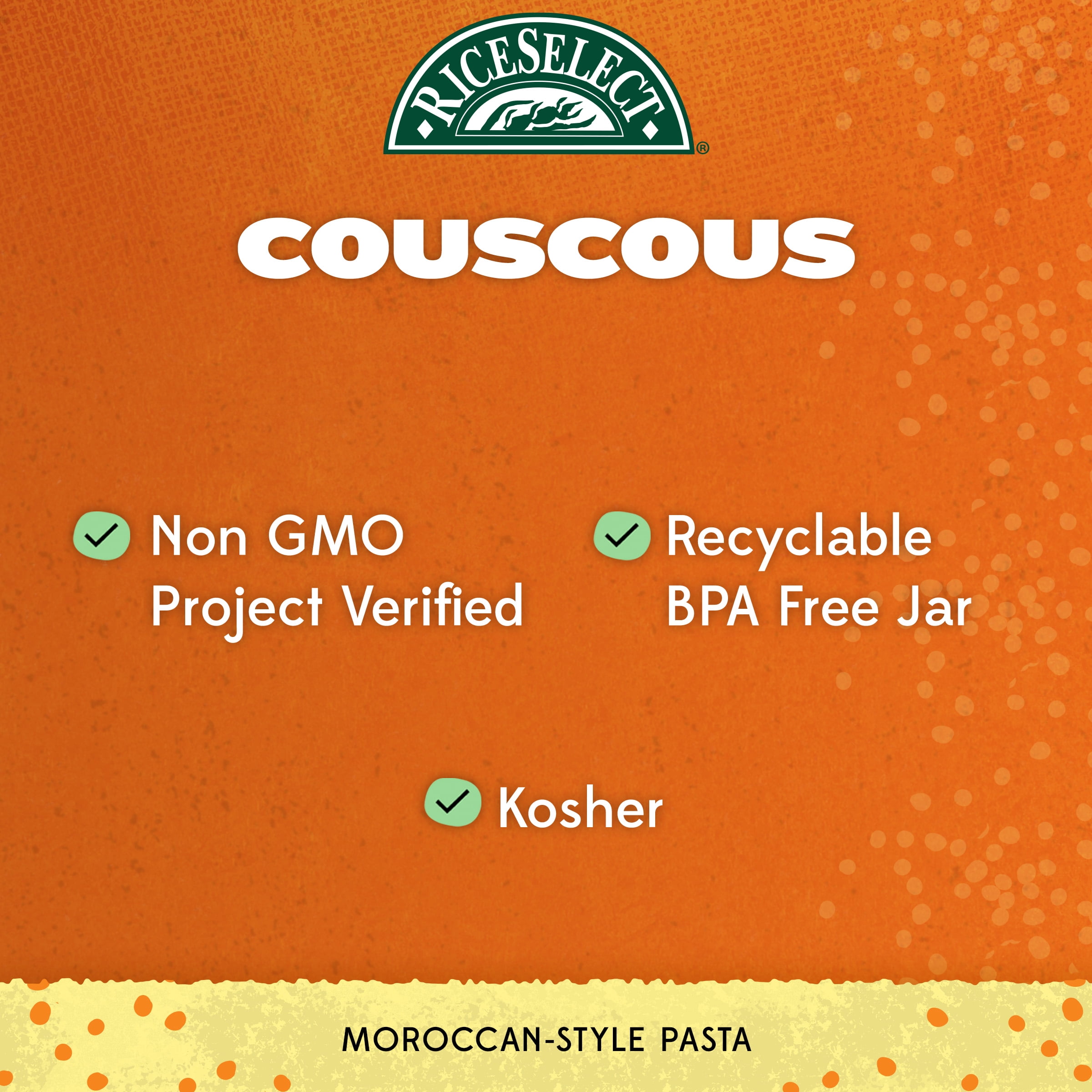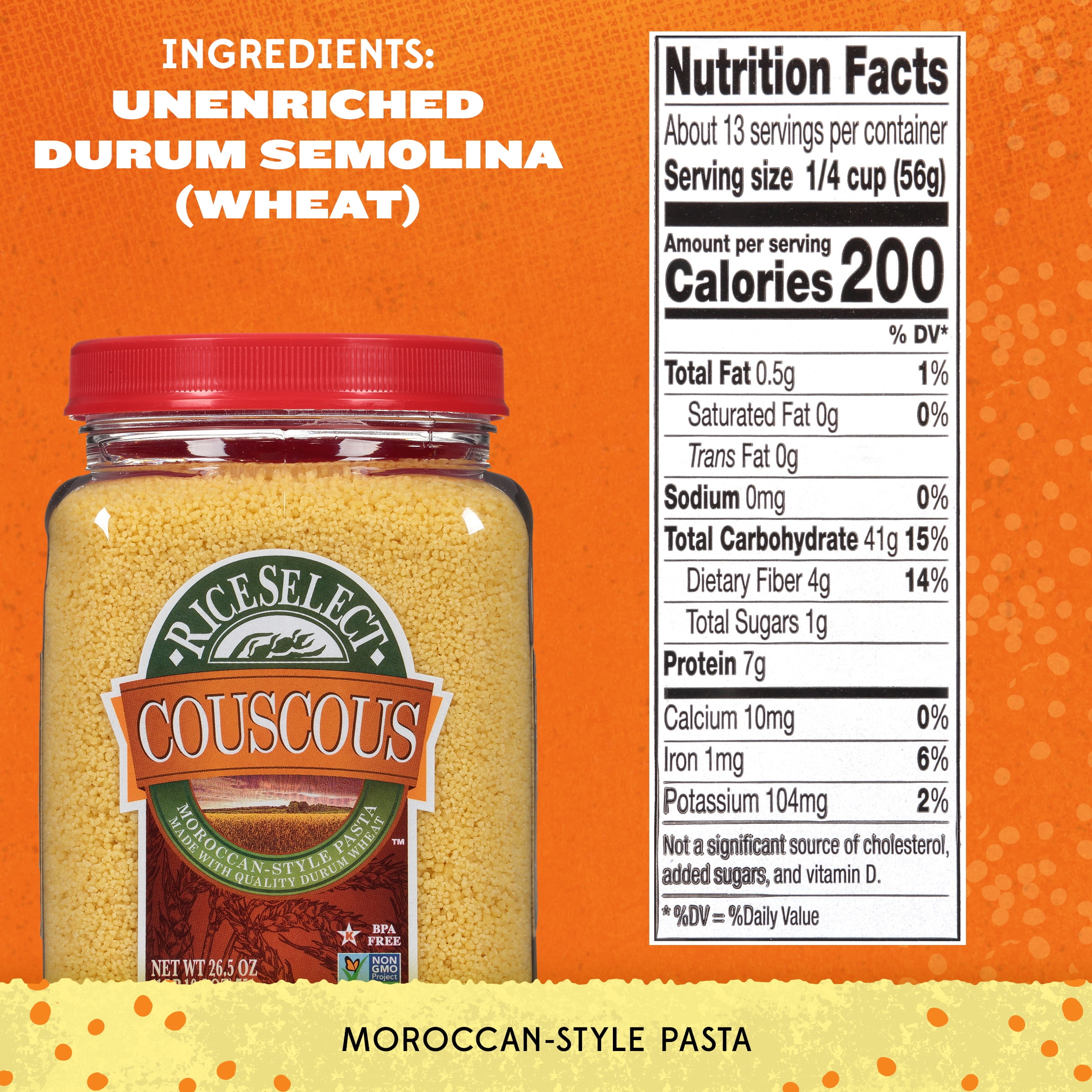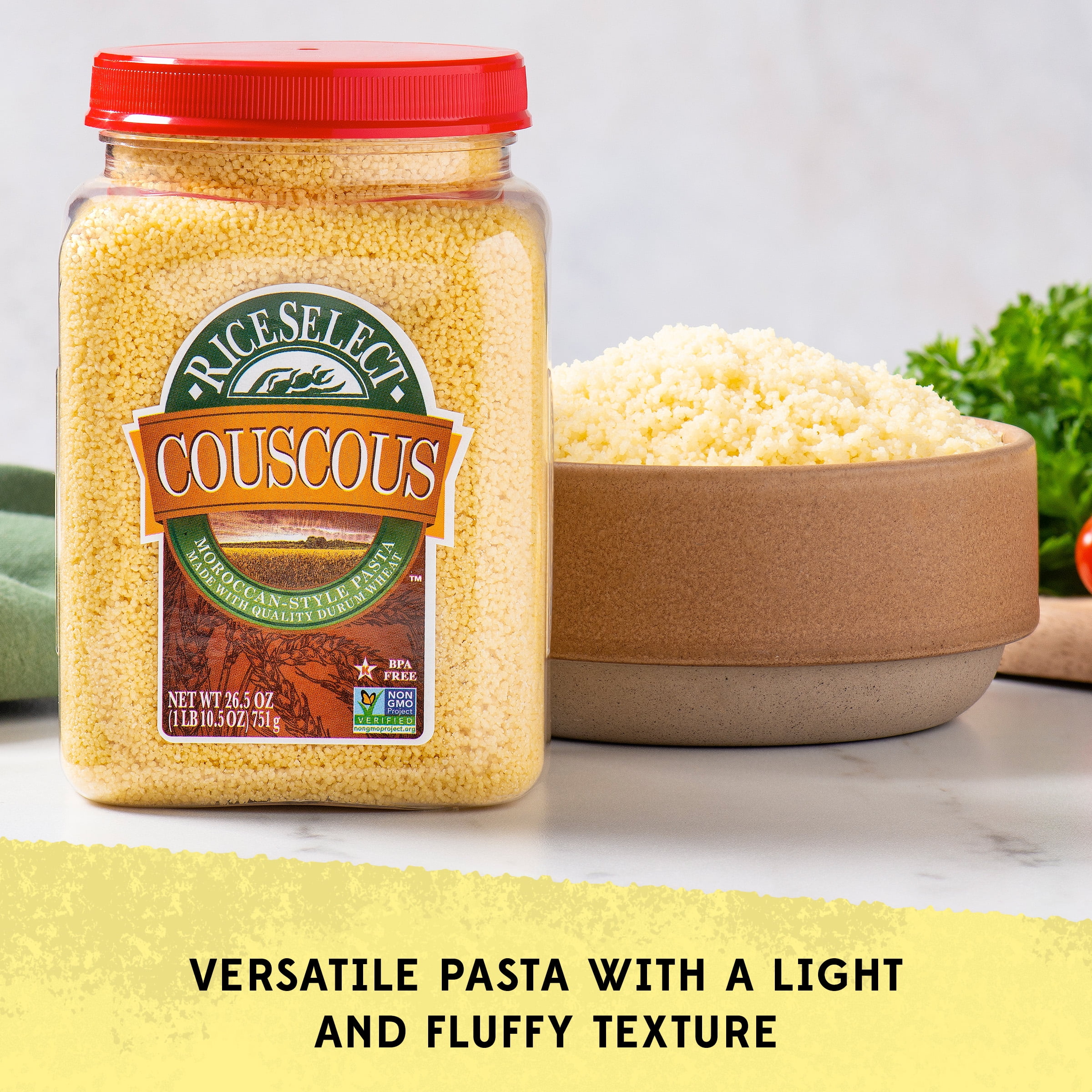 Traditional Moroccan Couscous is a small, natural pasta that’s extremely light and fluffy when cooked, but absorbs large amounts of flavor. This pasta resembles small balls that are made with 100% enriched durum semolina wheat. Couscous is prepared by steaming the pasta to create a light and fluffy consistency, and this grain’s versatile shape and short cook time of 5 minutes make couscous ideal as a stand-alone dish or paired with sauces, vegetables, and more. Plus, RiceSelect Couscous is Non-GMO Project Verified and Certified Kosher by Star K.