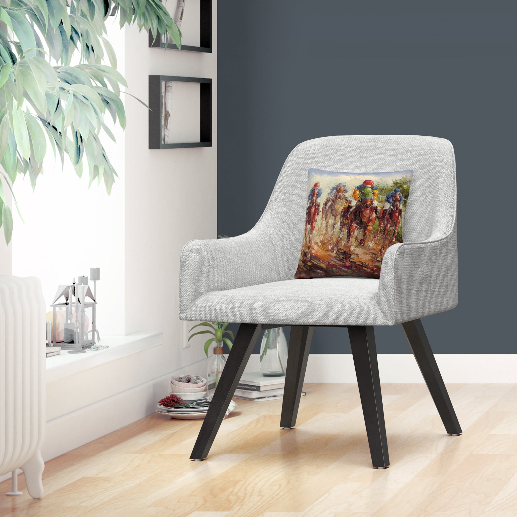 This decorative throw pillow features a horse race at the Kentucky Derby.