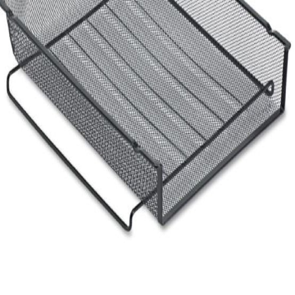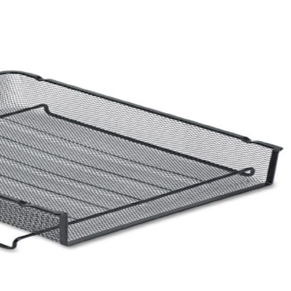Store and organize A4 or letter-size papers and files with the sleek Rolodex Mesh Stackable Front-Load Letter Desk Tray. With sturdy construction, this desk tray features interlocking feet so you can safely stack up to three trays. Desktop File Folder Sorter Type: Horizontal & Stacking; Number of Compartments: 1; Material(s): Wire; Width: 8 1/2".
