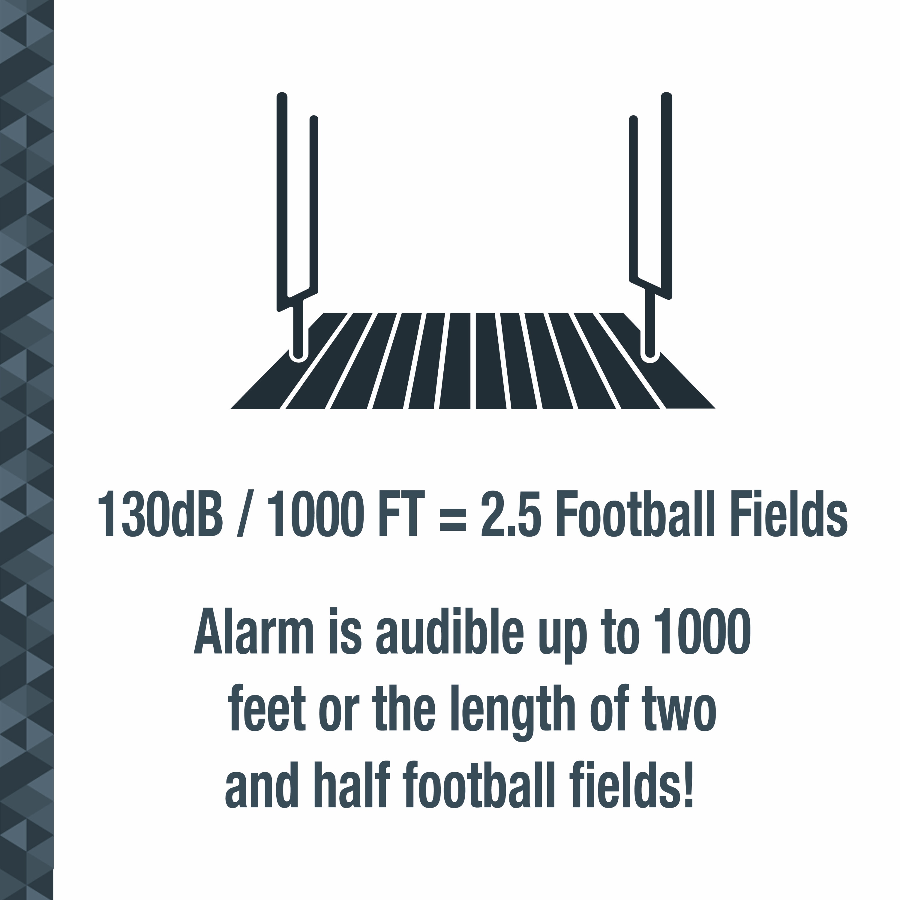 - Calls For Help In An Emergency: Extremely loud 130 dB alarm can be heard up to 1,200 feet (381 meters) away (farther than three football fields end on end), helping to deter attackers and alert others you need help