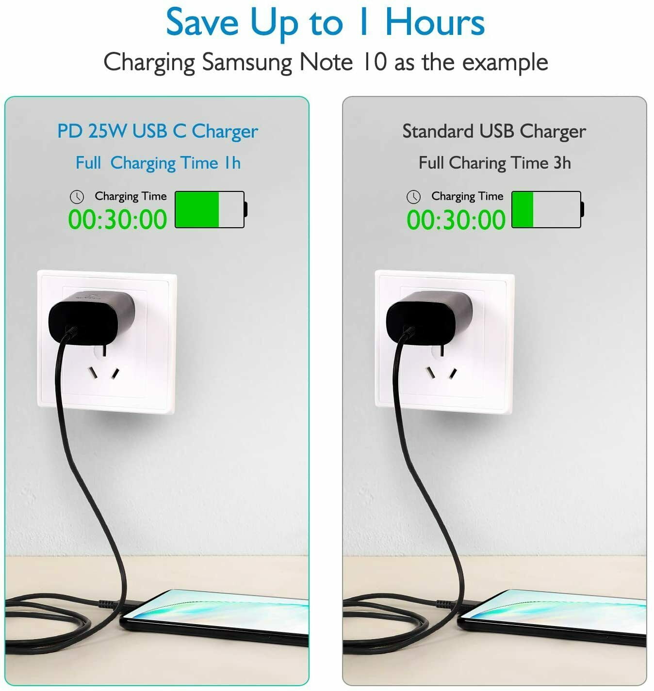 Samsung USB-C Super Fast Charging Wall Charger-25W PD Charger Adapter with Type-C Cable(3.3ft) for Samsung Galaxy S20/S21/S21+/S21Ultra/S10 5G /Note10/Note10 Plus/Note 20/S9 S8/S10e ◆Rapid Charging:Plug into any standard wall outlet via the include AC adapter. The super fast charger delivers up to 3 amp to give your phone power at a much faster rate than your standard 1a or 700mA charger ◆Flexibility:a detachable USB-C to USB-C cable is included, so you can charge your phone from any other USB-C power source such as your computer or a portable battery. Use the cable to sync and transfer files at blazing speeds with your Galaxy or any other compatible smartphone or laptop. ◆Universal Compatibility:Supports most of USB-C devices,including Samsung Galaxy S20/S20+/S20 Ultra/S21/S21+/S21Ultra/Note 10/ Note 10+/ Note 20/ Note 20 Ultra/ S10 5G,iPad Pro 11/12.9 2020/2019,Google Pixel,Google Pixel, Pixel 2, Pixel 3, Pixel XL, Pixel 2XL, Pixel 3XL, Pixel 3A,LG G7 Thing, G8, G6, G5, Stylo 4, V20, V30, V35, V30S, V40 ThinQ Plus, Motorola Moto Z and more ◆Superior Safety Fast Charging:Match UL safety standard to advoid over-load, short current and overheat.Continuous high-power output will have a temperature rise, but they are all within the safety limits of standard certification ◆What You Get:25W PD USB C wall Charger ×1, 3.3ft Type C Cable ×1,24-hour customer service, if there are any quality problem, please contact us