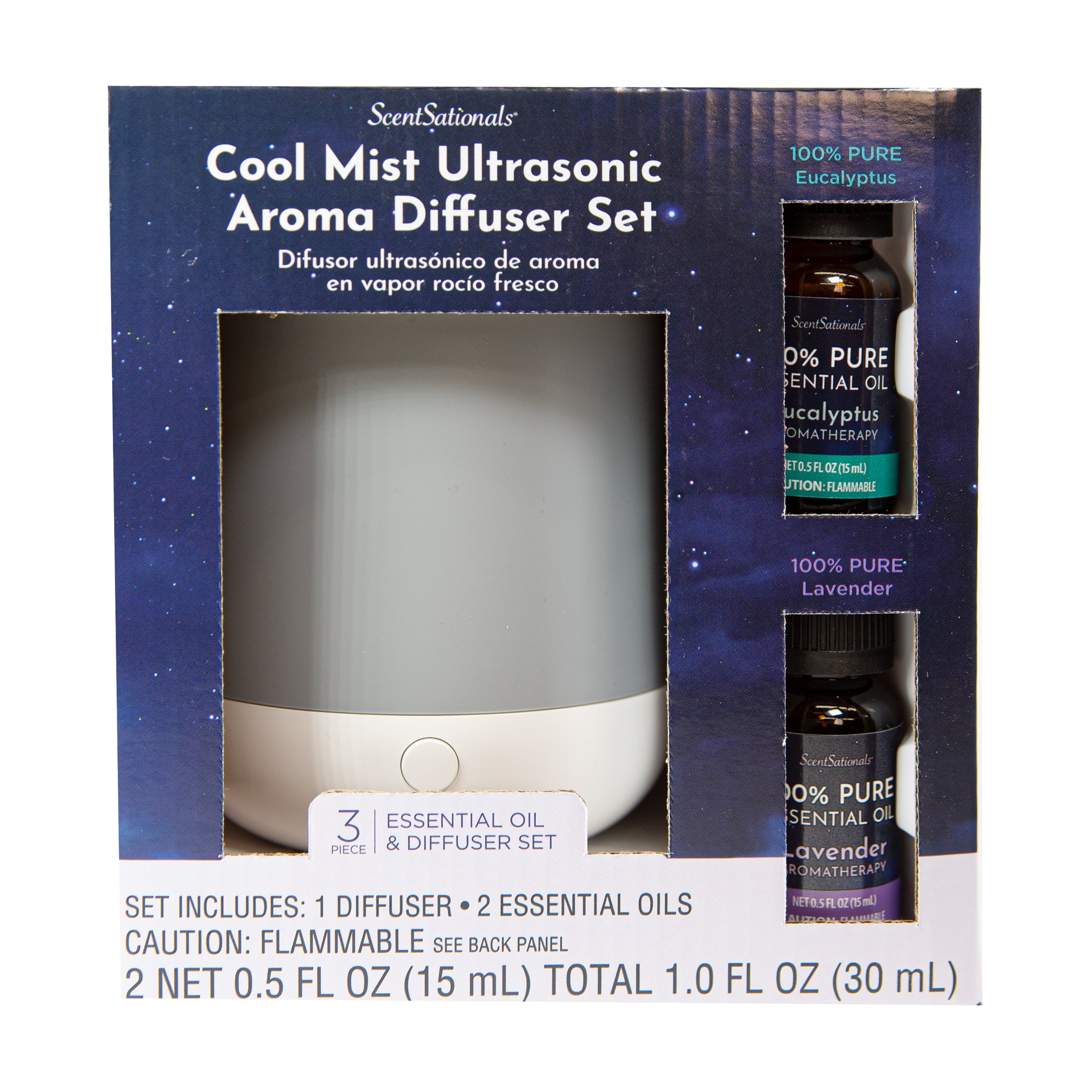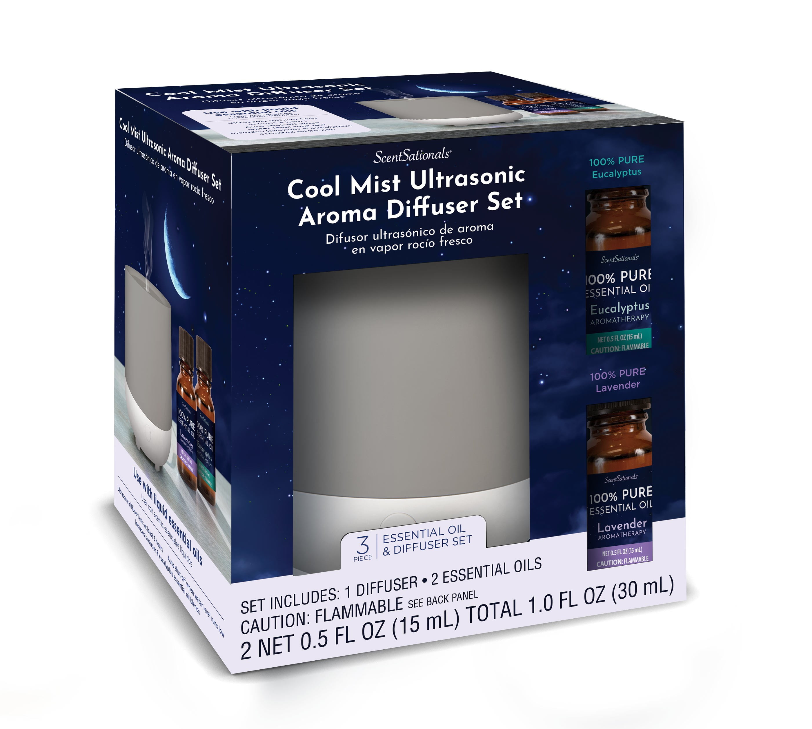 The ScentSationals 3 Piece 100 mL Grey Diffuser Set includes 1 diffuser and 2 100% pure essential oils. The diffuser humidifies the air while enhancing your home or work environment with soothing aromatherapy. Cool mist diffusers humidify the air in your home by utilizing ultrasonic vibration to release a cool mist into the air. For safety, it automatically shuts off when the water reservoir empty. This cool mist aroma diffuser has a 100 mL capacity which can last at least 3 hours. Combine your favorite essential oils to create custom blends. Perfect as a starter set for beginners, dorm rooms, traveling, and taking the benefits of essential oils everywhere you go.