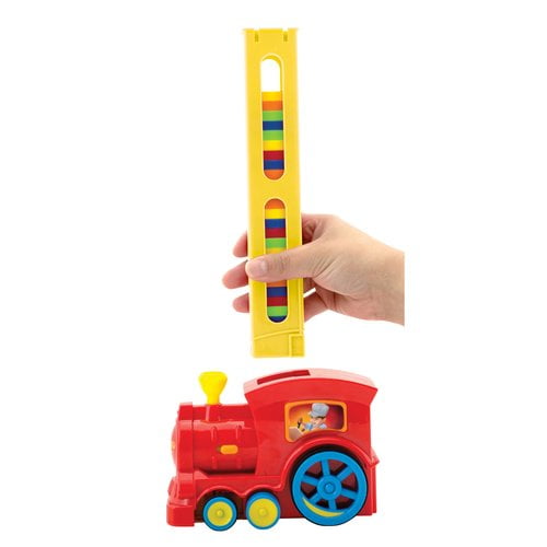 Chug your way into fun with our domino train! Fill the cartridge and start the train to lay your domino trail. A motorized train that works like magic, the Domino Train from Schylling Toys the world leader in traditional toys and classic fun will set dominoes up on end automatically as is chugs across the floor. Just load the domino cartridge and place it in the train, set the path by steering with the smokestack and the engine plays lively sounds as it set the dominoes. As if by magic, all the dominos are placed on end and perfectly spaced. The headlight lights up to guide you along. Once set, have fun knocking them down in in classic domino fashion.Schylling Domino Train