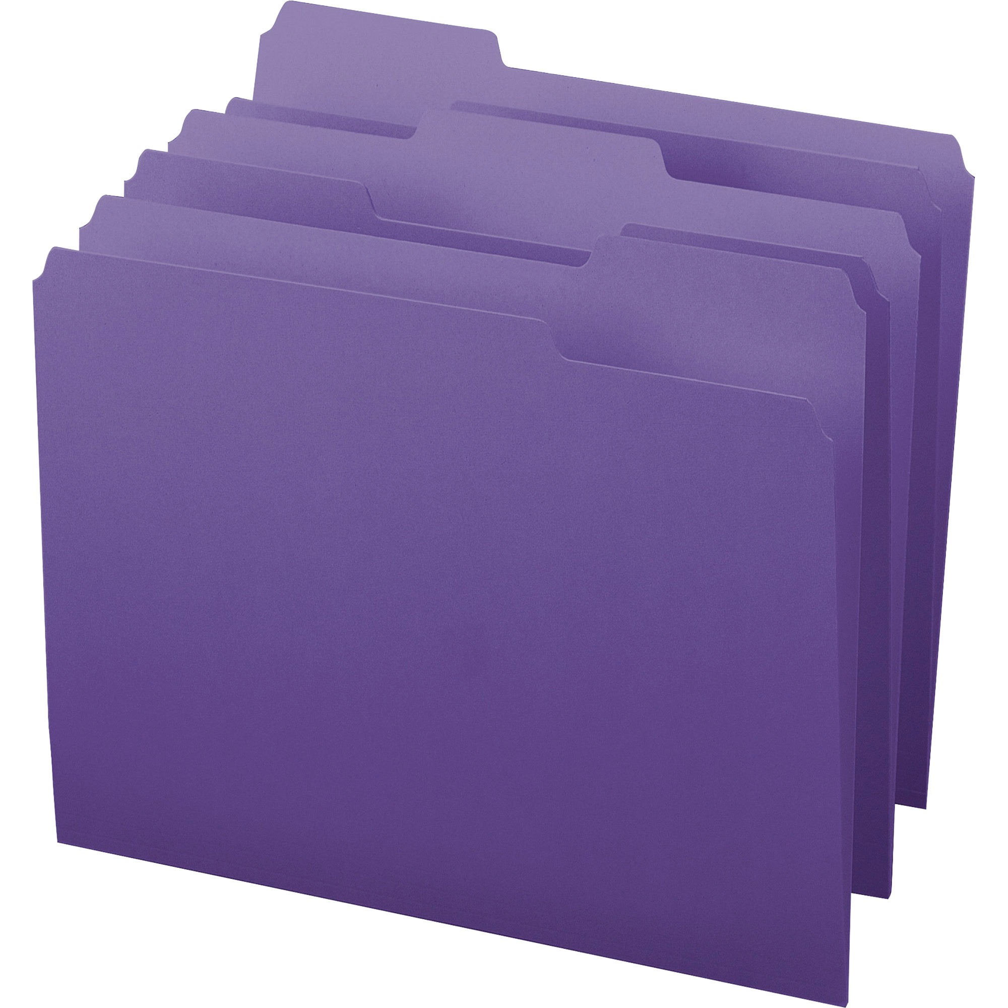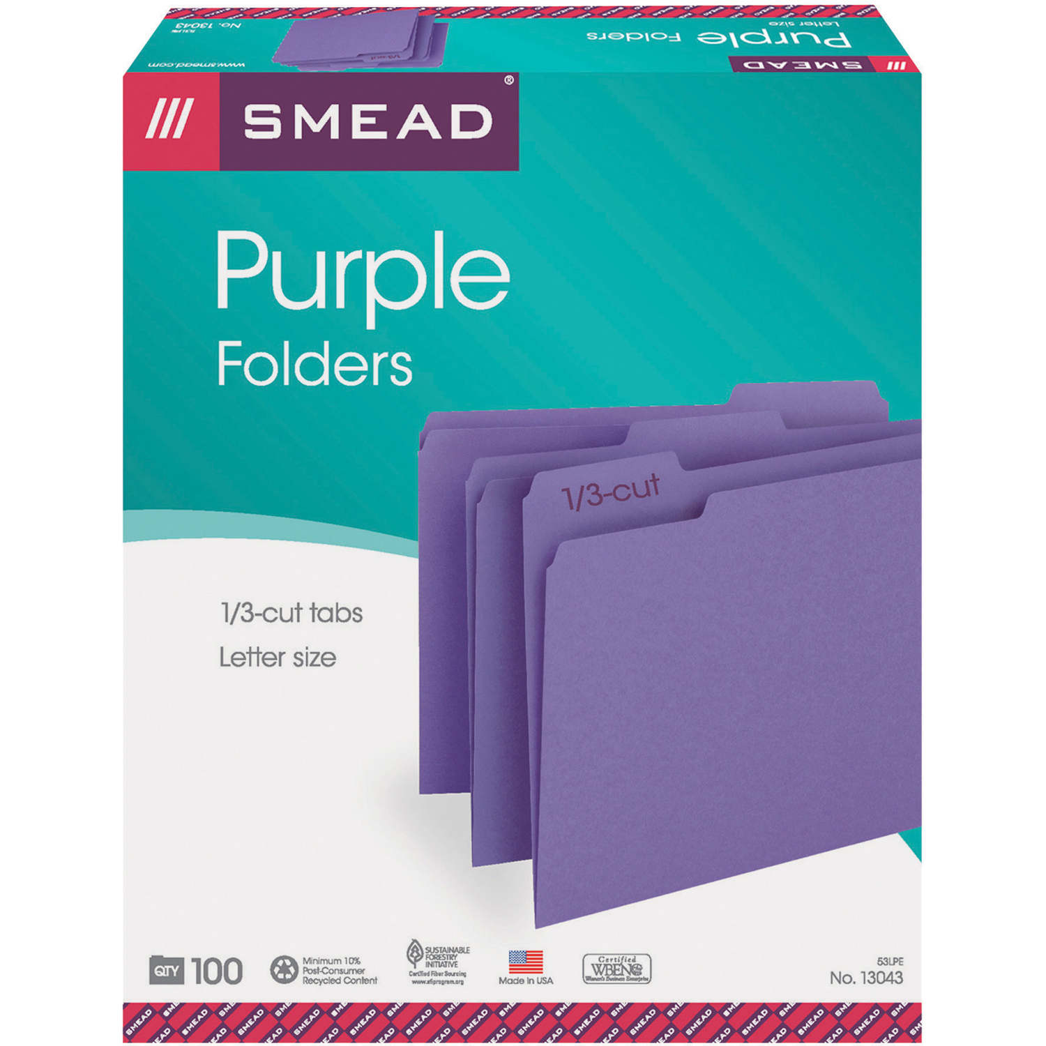 Speed filing and retrieval time by using color to categorize different types of folders. Single-ply is the economical choice for files that are seldom accessed.Smead File Folder, 1/3-Cut Tab, Letter Size, Purple, 100 per Box (13043)