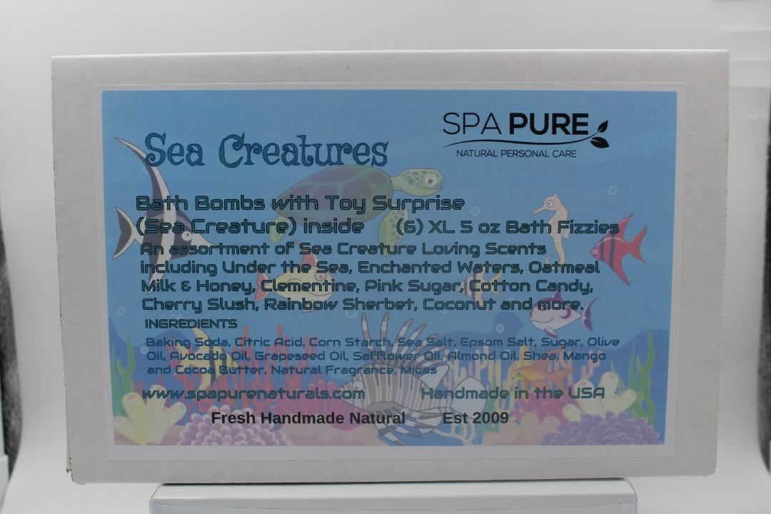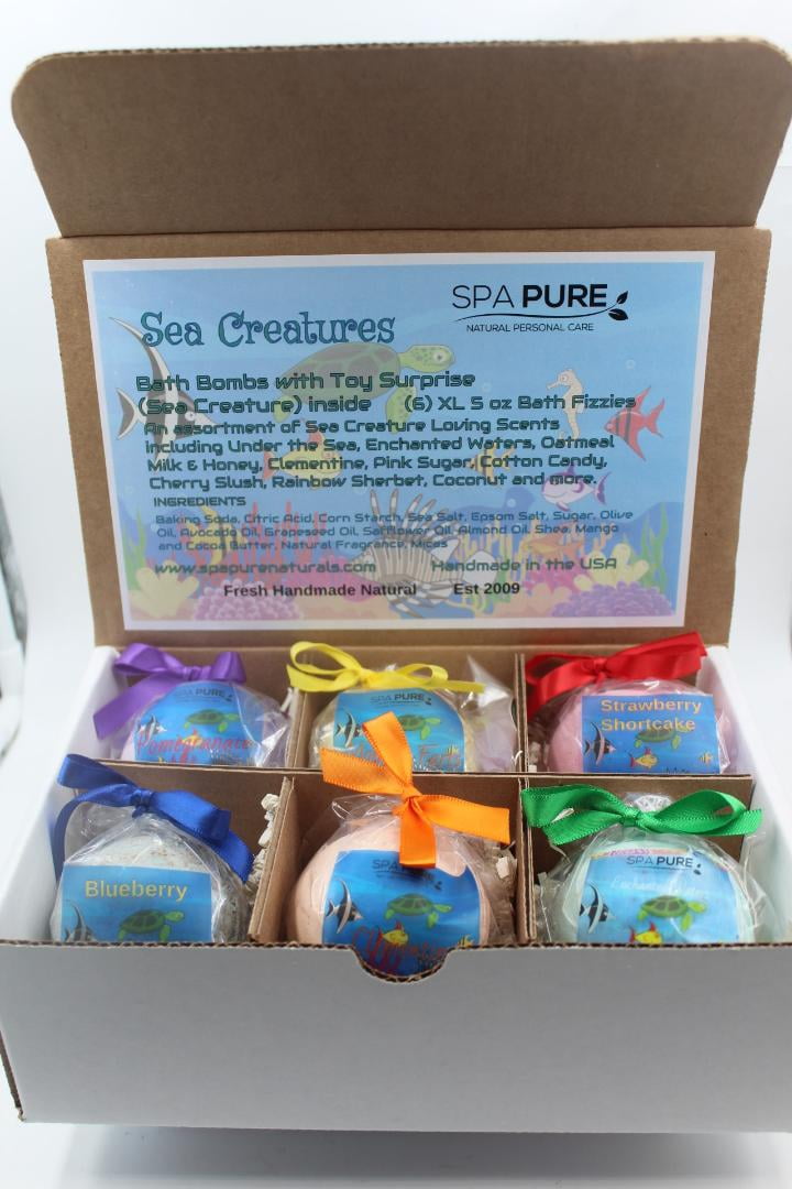 LARGE SEA CREATURES need big bath bombs. This Gift Set contains 6 XL bath bomb fizzies that are 5 oz each with a SEA CREATURE tucked inside.