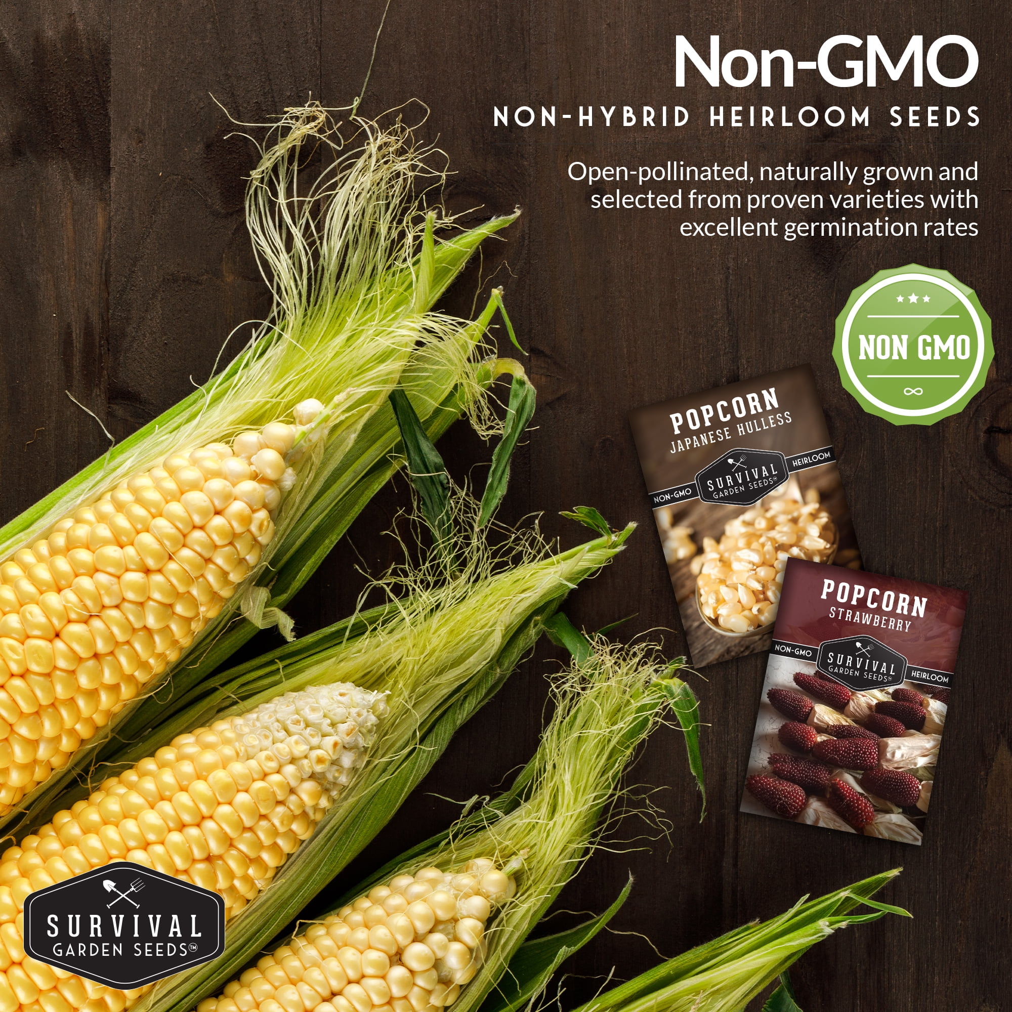Strawberry popcorn produces miniature 2-3" ears that have deep garnet kernels. Each ear looks like a strawberry. Makes a great fall decoration. Kids love to grow and eat this unusual popcorn. Japanese Hulless popcorn grows 4-5′ in height. Each stalk produces 2-3 ears of corn that is 4-6" long and 2" around. Kernels can be popped for snowy white popcorn with almost no hull in the center. Open-pollinated heirloom. These seeds for planting in your family vegetable garden will help secure your family’s needs. Each package includes instructions for successful growing to help even a beginner gardener get started. Full sun, annual vegetables.