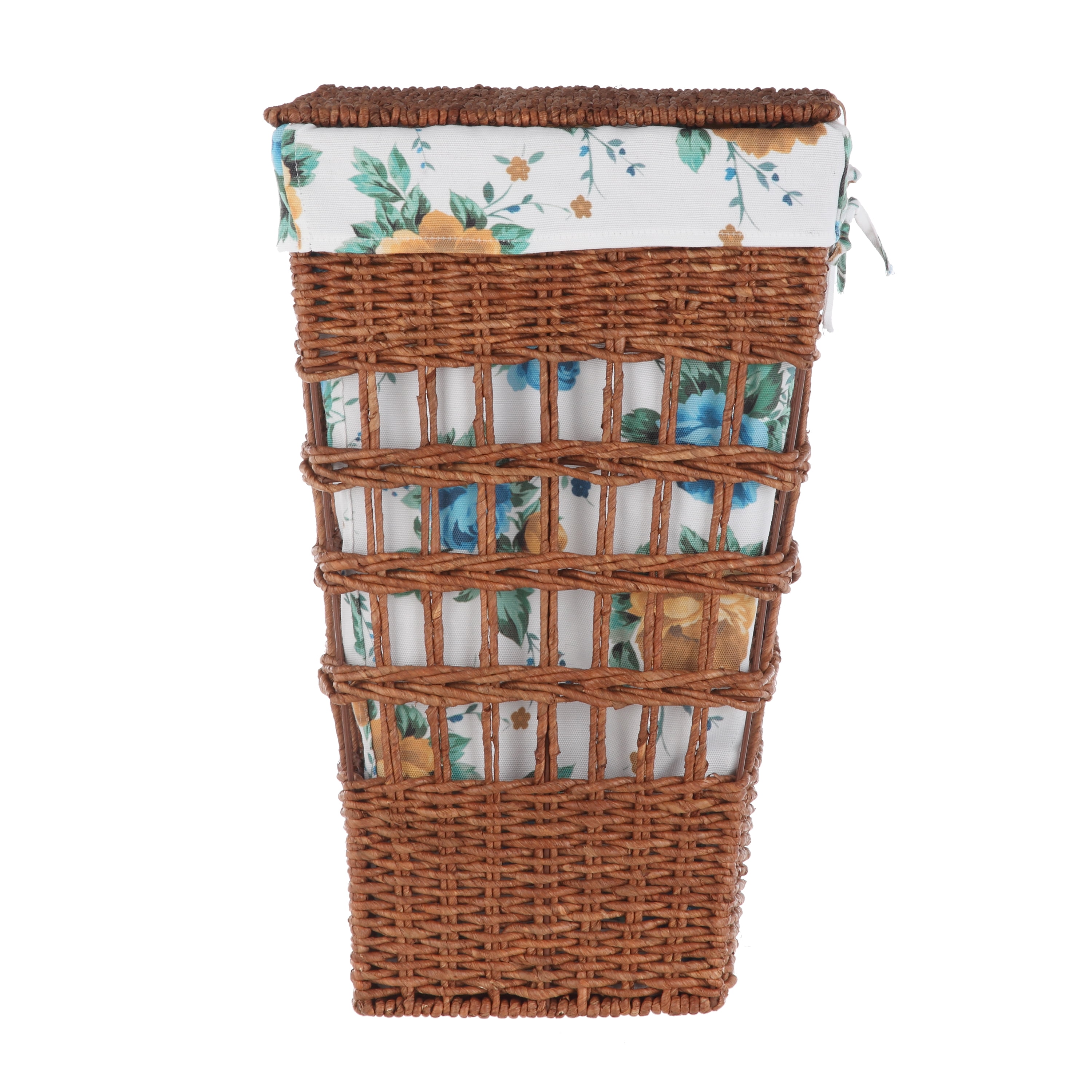 Spruce up your home with this pretty new hand woven laundry hamper. The Pioneer Woman Rose Shadow Laundry Hamper combines style and functionality. It is designed to meet your everyday laundry needs, while still adding a decorative touch to your home. The laundry hamper includes a removable liner that has an attractive white background printed with blue and golden yellow roses with green accents. The hamper itself is rectangular with tapered sides, in a medium brown. The liner can be removed and machine washed. Update your laundry room, bathroom, bedroom and closet with this attractive laundry hamper. SKU Number PW18SP1VS18731E. Model Number VS18731E. RENEWABLE MATERIALS. Variances in color may be apparent due to product being handcrafted using a natural material.