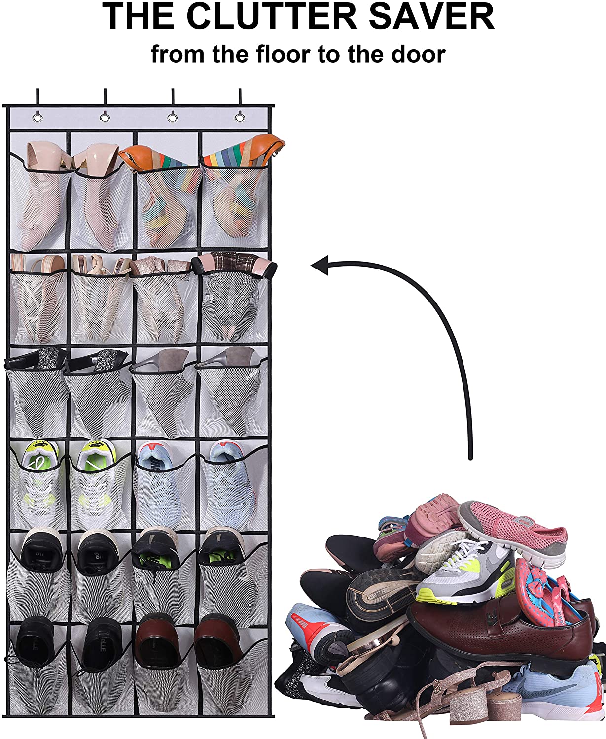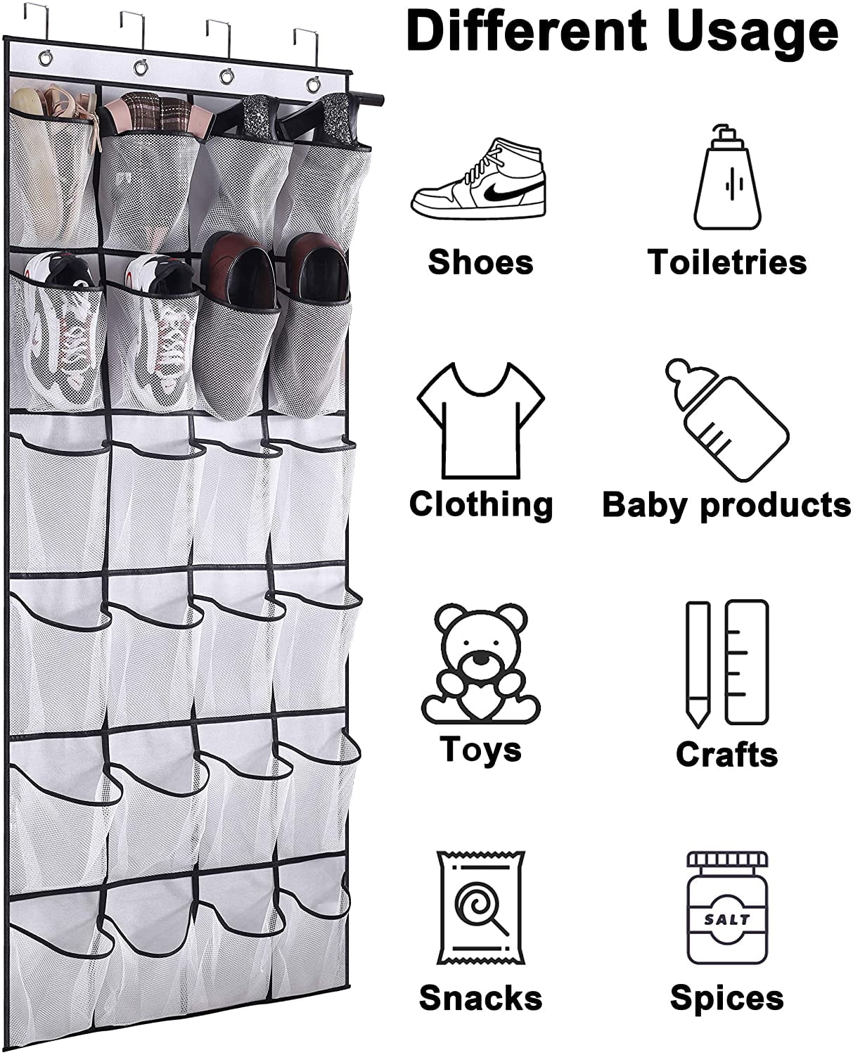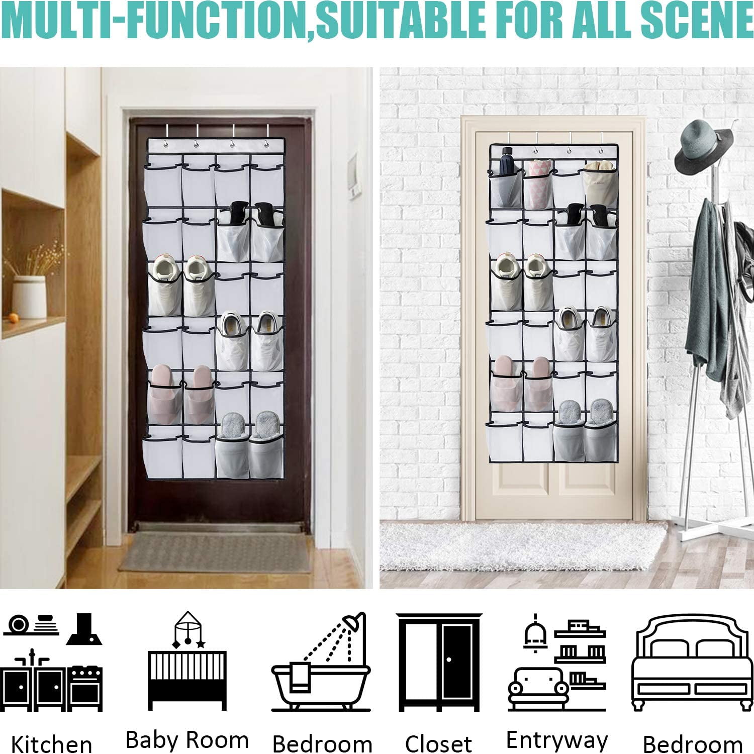 - MULTIFUNCTION & WIDELY SCENE:Hanging organizers will give you more choice to storage where you want. The hanging shoe rack organizer for back of door is not only for kinds of shoes(flip flop, sandal, sneaker), but also can be door organizer to organize your beauty supplies, hair products, cleaning supplies, kids’ toys, scarves, gloves…