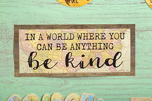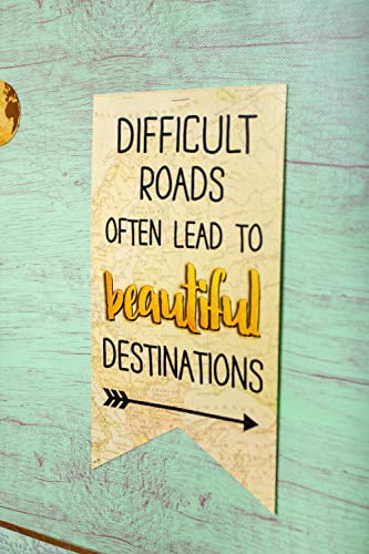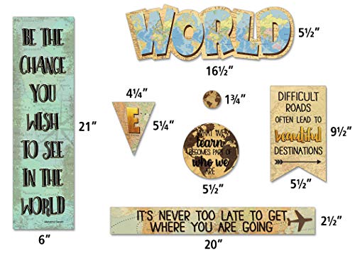 A classroom’s bulletin board is often a focal point for students, so finding the right bulletin board decorating set is important when setting up a classroom. The vintage-inspired maps and inspiring quotes will motivate learning journeys. Use this display with other "Travel the Map" themed products to decorate your classroom. Largest piece measures 6" x 21". Set includes: 14 decorative signs with positive sayings, 7 pennants spelling out “EXPLORE”, 1 arrow, 2 globes.