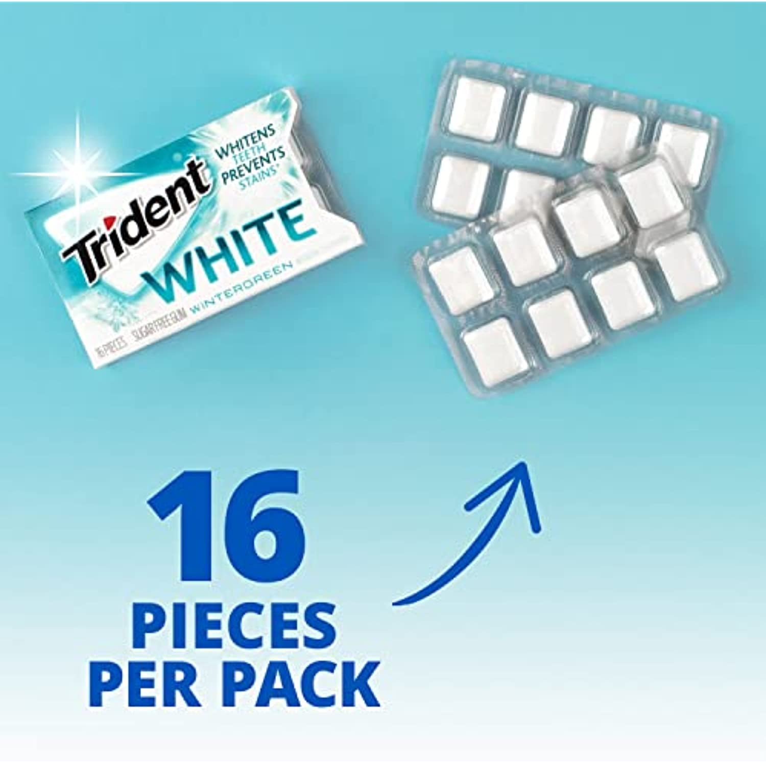 Trident White Wintergreen Sugar Free Gum is sugar free wintergreen gum that whitens teeth, prevents stains and gives you extra fresh breath. This delicious wintergreen gum brings sparkle to your smile by whitening teeth and preventing stains. Each piece of minty teeth whitening gum is easy to pop in your mouth, and Trident White gum contains 35% fewer calories than sugared gum. Chewing two pieces of this Trident White sugarless gum at least four times per day after meals helps remove and prevent stains. Bulk gum packs of mint sugar free gum are perfect for stocking your office or home pantry. Individual packs of gum are easy to take on the go, whether youre setting off across the country or running errands around town.