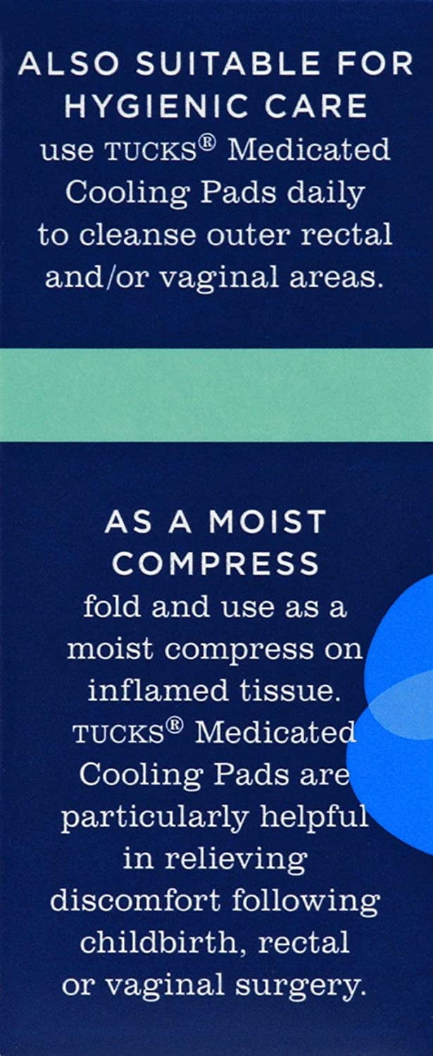 You are not alone. Over twenty percent of the adult population will get hemorrhoids. That means one out of five adults you know could have them. Now you have help. You have TUCKS. Cleanse and relieve discomfort with TUCKS Medicated Cooling Pads. They are pH-balanced, hypo-allergenic, dye-free, and biodegradable when flushed. Also suitable for hygienic care. Use TUCKS Medicated Cooling Pads daily to cleanse outer rectal and/or vaginal areas. As a moist compress: fold and use as a moist compress on inflamed tissue. TUCKS Medicated Cooling Pads are particularly helpful in relieving discomfort following childbirth, rectal or vaginal surgery.