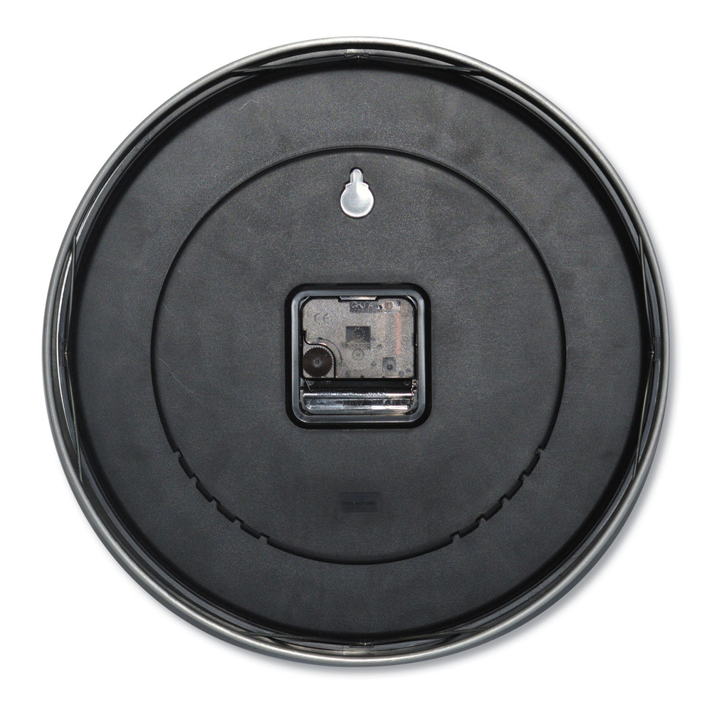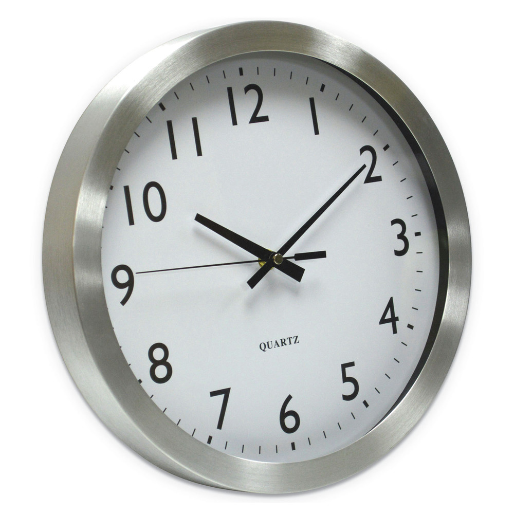 This contemporary 12" clock is 1.75" deep featuring a brushed steel finish. The large bold numerals on the white face provide extra clarity and readability. High quality quartz movement insures accurate timekeeping. Second hand. One AA battery sold separately.