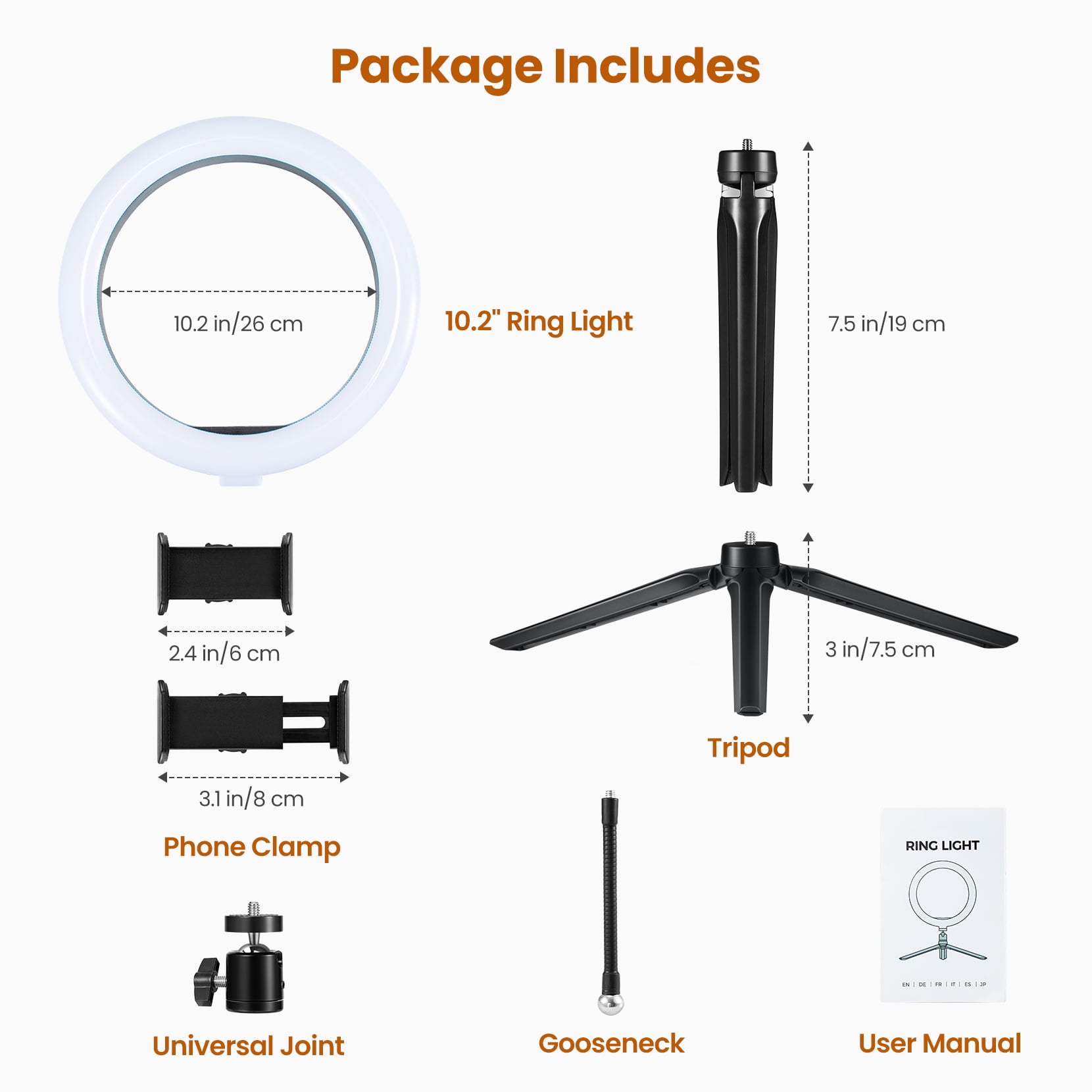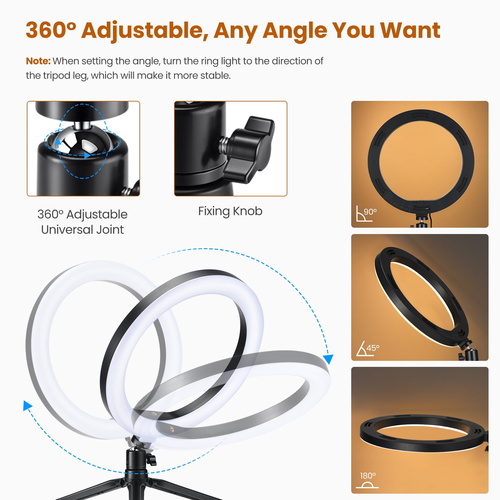 - 【Stability and Adjustable】The sturdy and durable phone tripod can be well stabilized on your table without shaking, the universal joint can rotate the LED ring from 360°, once the ideal angle is found, the knob will lock it In place. (Note: It is not recommended to adjust the height of the tripod, this phone tripod is only suitable for desktop)