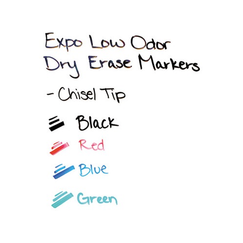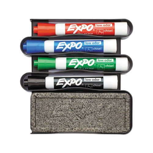 Expo Low Odor Dry Erase Markers Starter Set has everything you need to get started working on your whiteboard. The set includes an Expo eraser and an assortment of Expo markers. The whiteboard markers feature bold ink thats easy to see from a distance and provides consistent color quality. The dry erase marker ink is specially formulated to be low-odor making it perfect for use in classrooms, offices and homes. Use your colorful Expo dry erase marker kit to track, schedule and present. Marker Ink Type: Dry Erase Marker Tip Type: Chisel Marker Tip Size text: Broad Marker Colors: Assorted.