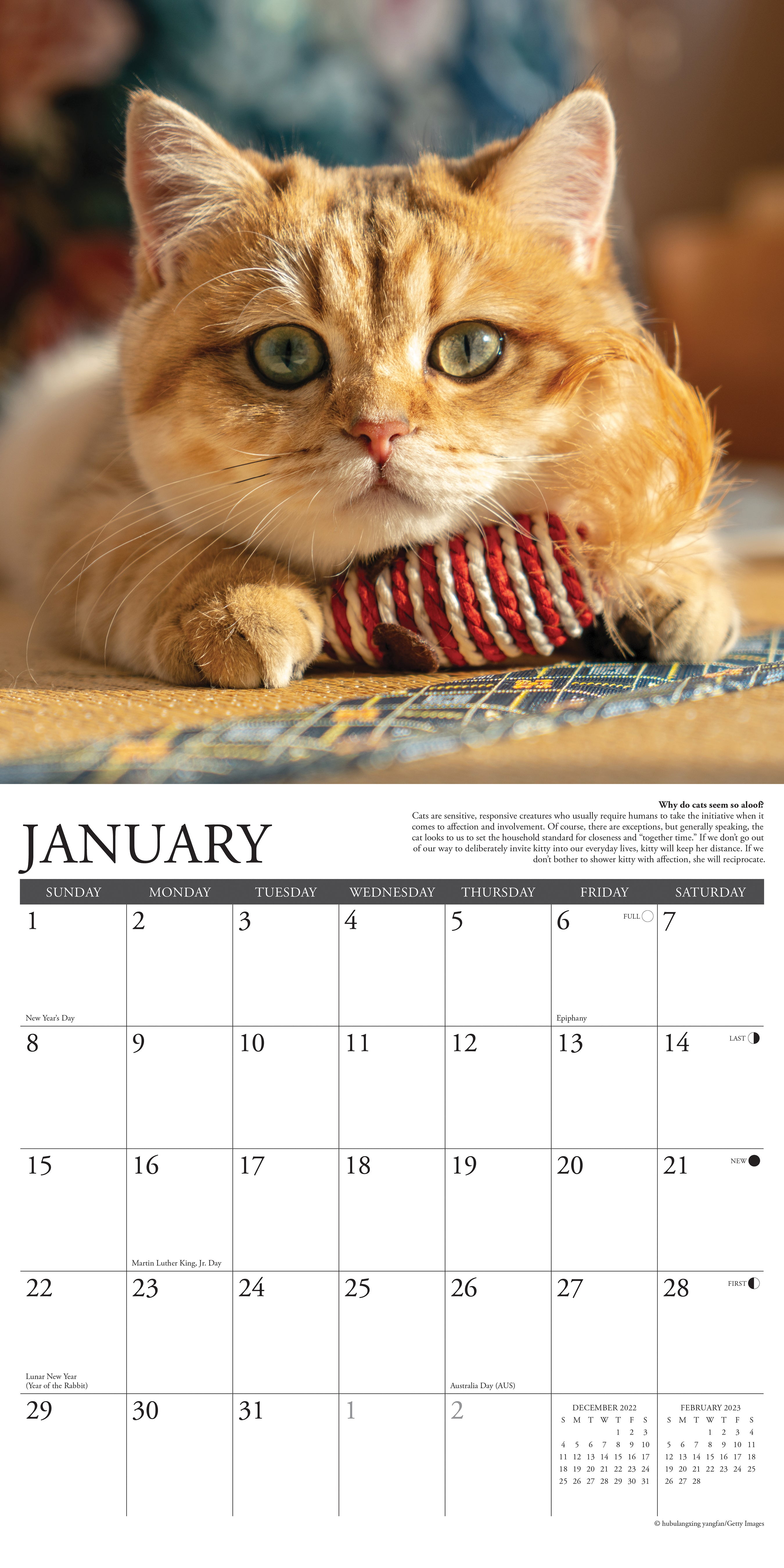 Twelve curious cat behaviors are illustrated with vivid full color photographs and explained in descriptive text. Printed with soy-based inks on FSC certified paper, this 12" x 12" wall calendar features large monthly grids that offer ample room for jotting notes, along with six bonus months of July through December of 2022. Also includes moon phases (CST), standard U.S. and international holidays.