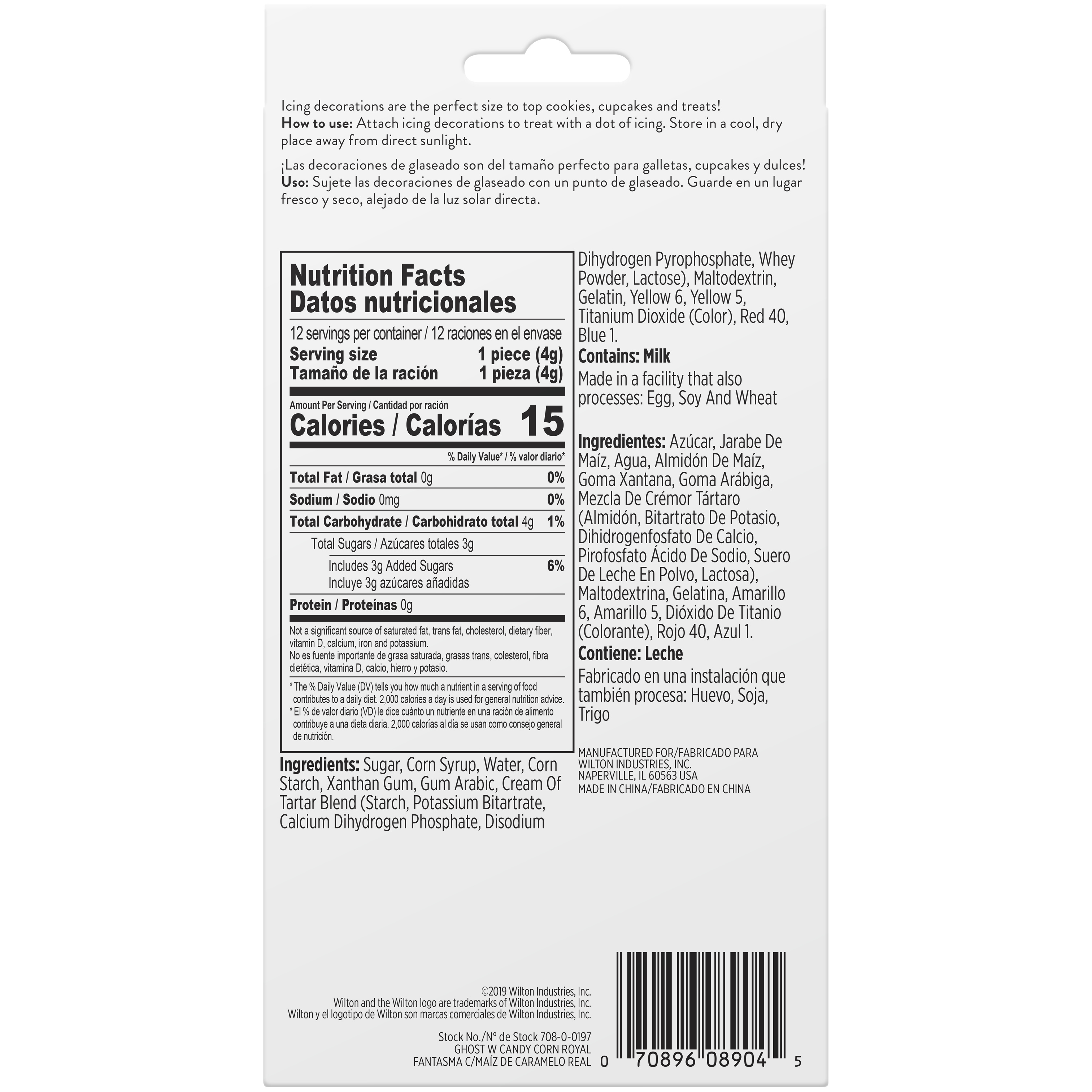 Candy, but make it spooky. Cute little icing ghosts holding candy corn are a fun way to add a festive touch to cupcakes, cookies, candies and brownies. Includes 12 ghosts.