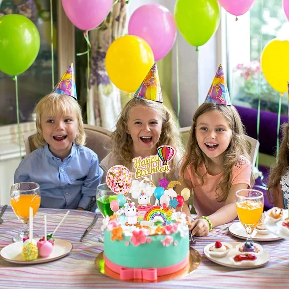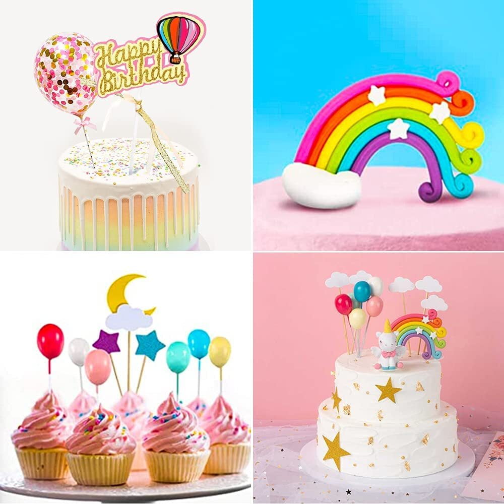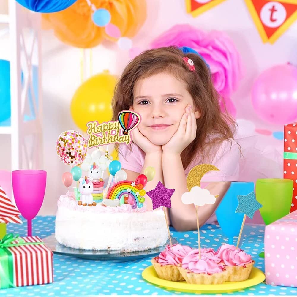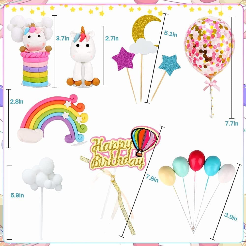 - 【Perfect Unicorn Cake Topper】This set including 1*Rainbow Unicorn, 1*Sitting Unicorn, 6* Balloons, 1*Rainbow, 2*Star, 1*Moon, 1*3D Cloud, 1*Colorful Latex Balloon and 1* Happy Birthday Banner. Fits most on 6inch-10inch cakes.