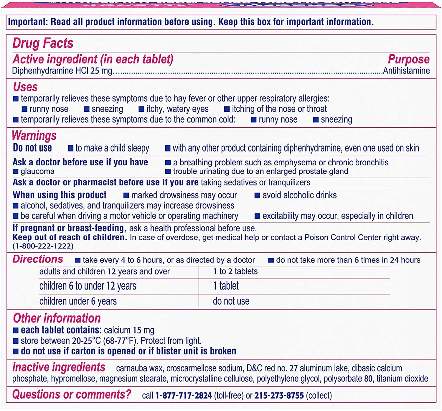 Benadryl Allergy Ultratabs Diphenhydramine HCl 25 mg Antihistamine Tablets, 100 Count