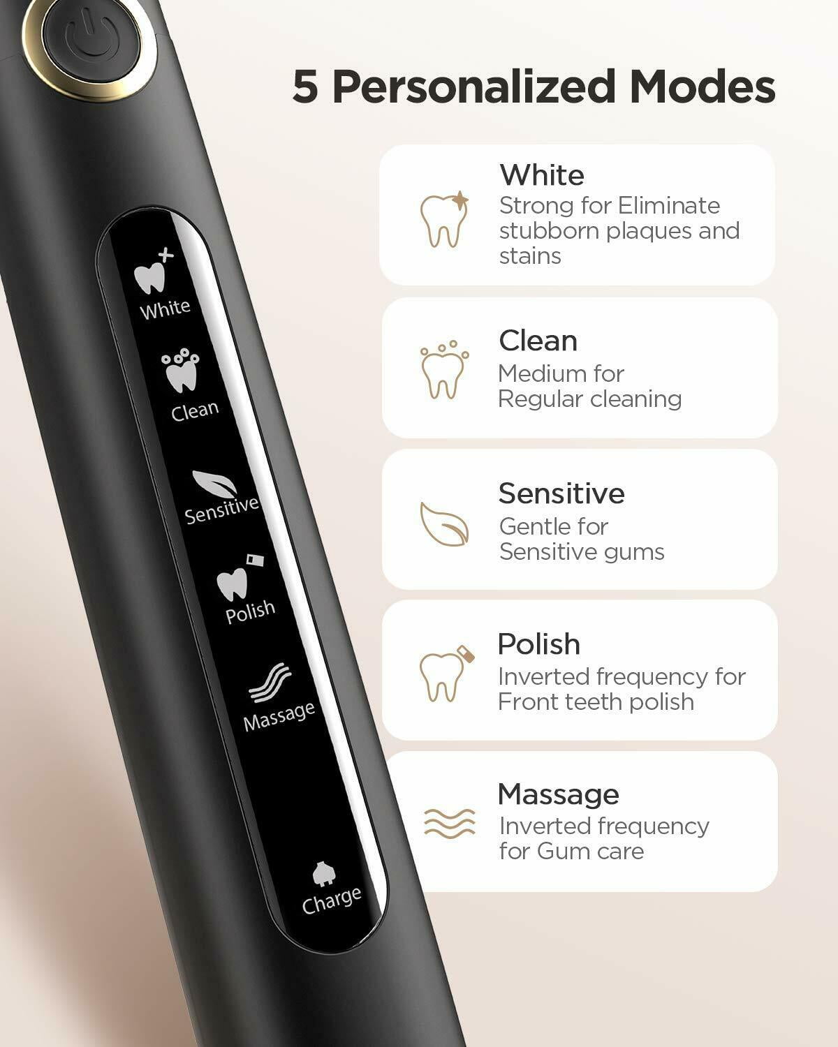 Electric Toothbrush UltraSonic Toothbrush Black Teeth Whiten 5 Cleaning Modes 12 Brush Heads Soft & Hard Heads,IPX7 Waterproof with Smart Timer