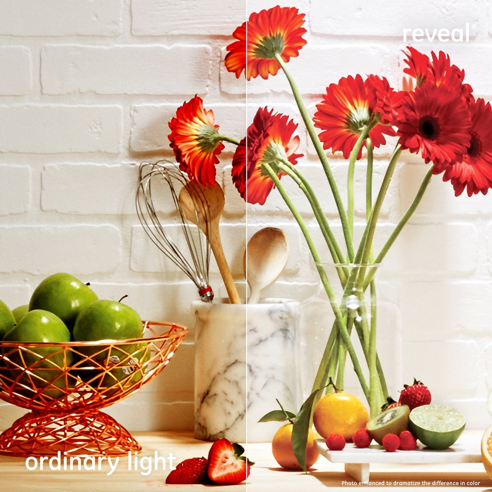 See clearly and experience more with GE’s best light. GE Reveal HD+ LED 60-Watt Replacement A19 light bulbs provide pure, clean light. The advanced technology enhances colors plus whitens white for exceptional clarity. Replace ordinary bulbs with Reveal light to see vivid colors and vibrant whites in high definition. They’re dimmable and illuminate your home with clean, beautiful light. These are great for frequently used fixtures-GE Reveal HD+ LED bulbs are rated to last twice as long as GE Basic LED bulbs and save 85 dollars on energy costs over the bulb’s life versus a 60-Watt Reveal incandescent bulb. Unlike CFL bulbs, GE Reveal LED HD+ bulbs feature exceptional color, instant full brightness and are free of Mercury. Replace CFL and incandescent light bulbs with GE Reveal HD+ LED general purpose light bulbs in indoor table lamps, sconces and open fixtures, including damp locations. Use them where clarity matters, especially kitchens, bathrooms and craft and hobby spaces. You’ll love the light, guaranteed.
