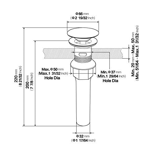 - 【STANDARD 1 3/4" DRAIN OPENING】-Fits bathroom sink hole diameter 1.46-inch to 1.9-inch. MAX. sink thickness 1.97-inch. Tailpiece diameter: 1 1/4". Ideal for sinks with overflow (above-countertop vessel sink, vanity sink, etc.)