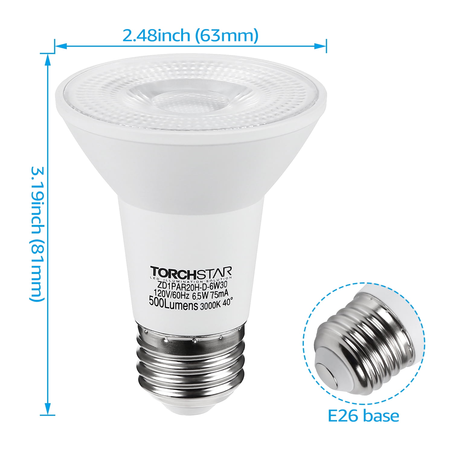 TORCHSTAR PAR20 LED Recessed Light Bulbs, Dimmable Spot Light, 6.5W=50W, 3000K Warm White, E26 Medium, Pack of 6