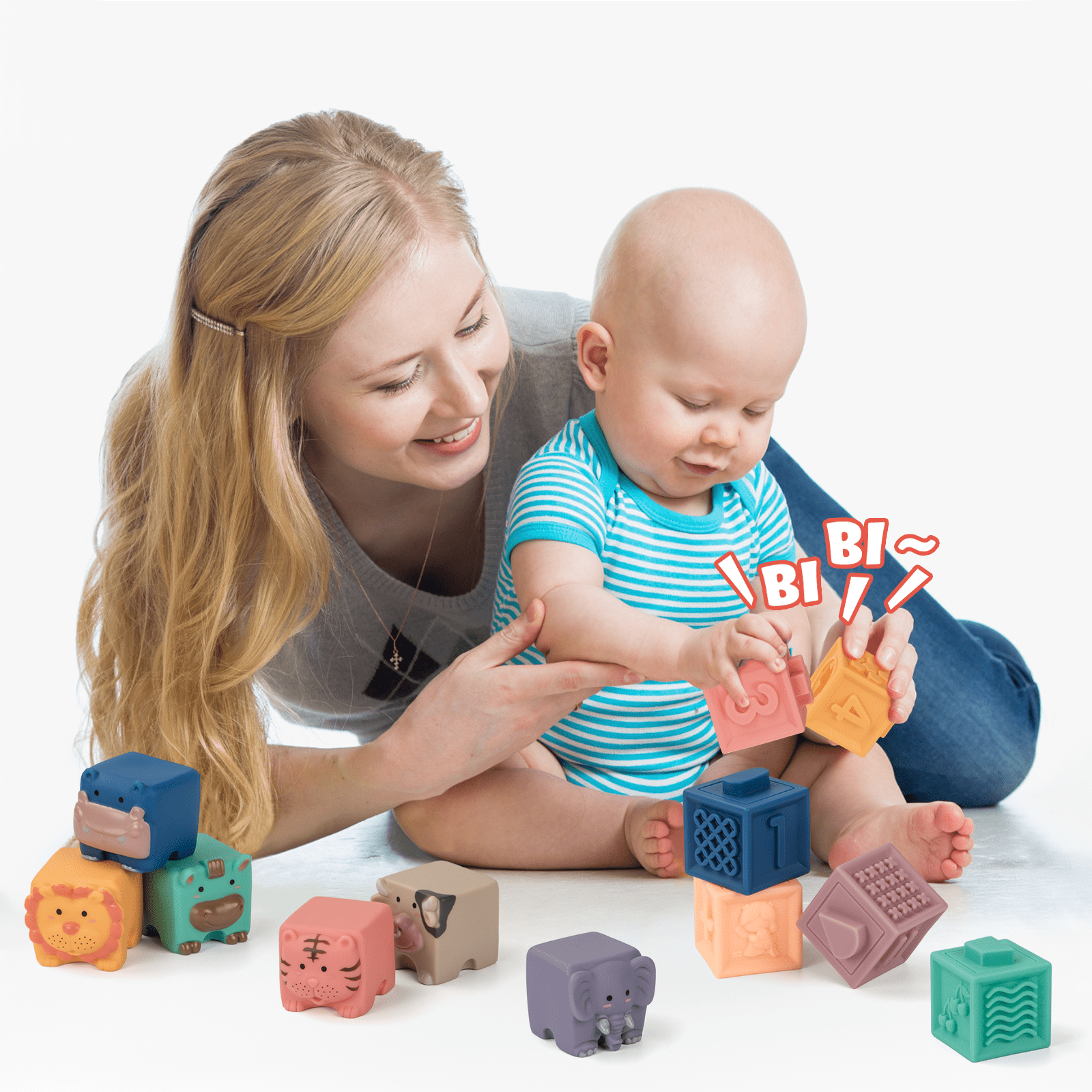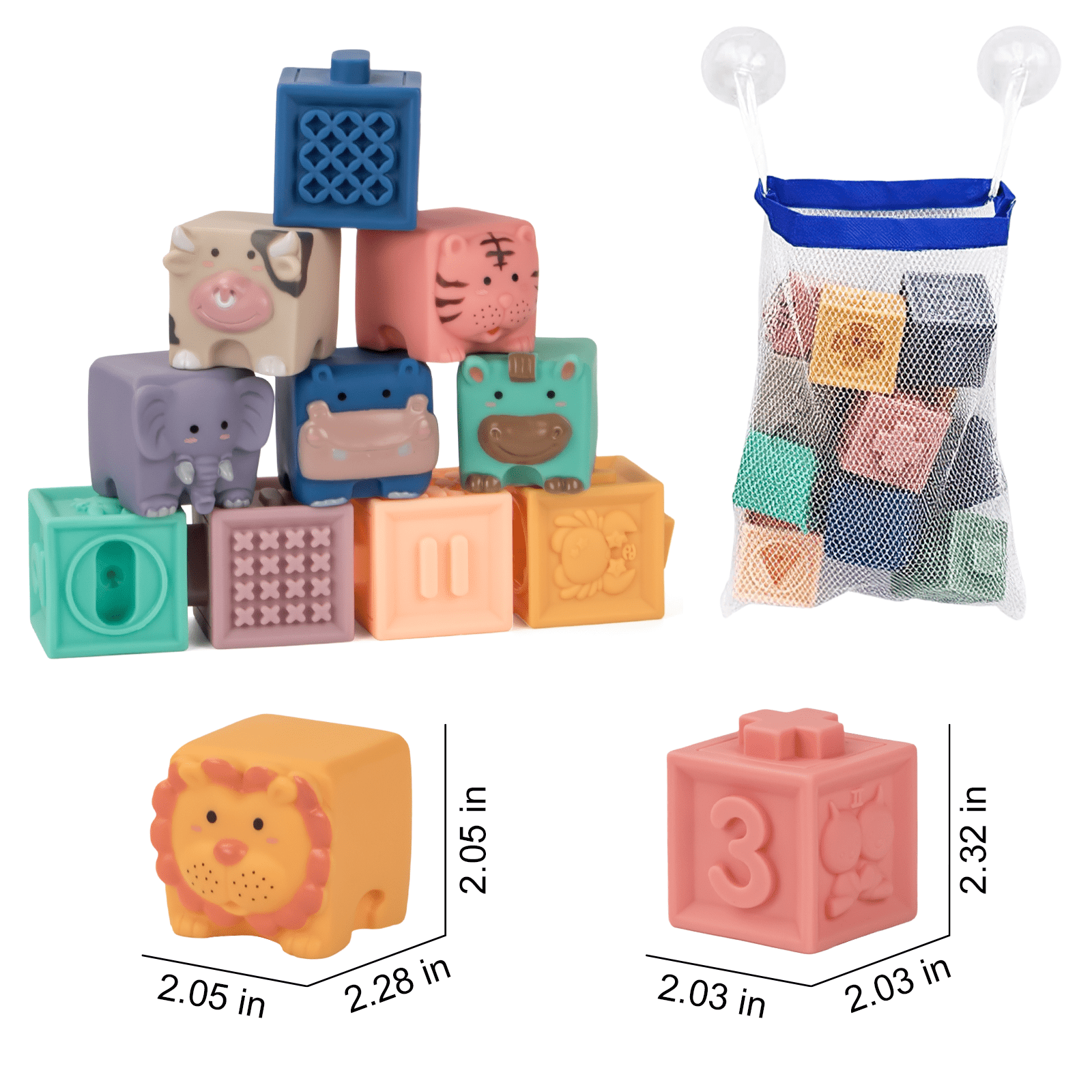 The building blocks toy has multiple functions. Encourage building, balancing, counting. These super soft blocks are made of food-grade silicone, BPA Free, non-toxic, which makes the product durable and safe. The 12 pieces of soft blocks are all completely different designs. Not only different colors but also interesting designs including animals, textures, numbers, and fruits. This baby block is a multi-purpose educational toy. Ideal for infants and toddlers.