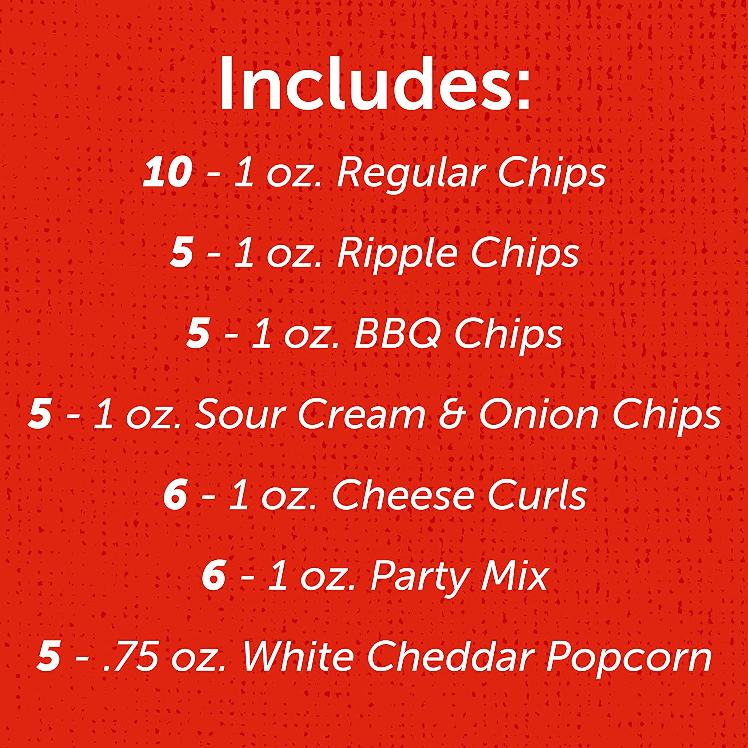 - VARIETY PACK: The Utz Snack Variety Box contains 10 – 1 oz. Original Chips, 5 – 1 oz. Ripple Chips, 5 – 1 oz. BBQ Chips, 5 – 1 oz. Sour Cream & Onion Chips, 6 – 1 oz. Cheese Curls, 6 – 1 oz. Party Mix, 5 – .75 oz. White Cheddar Popcorn.