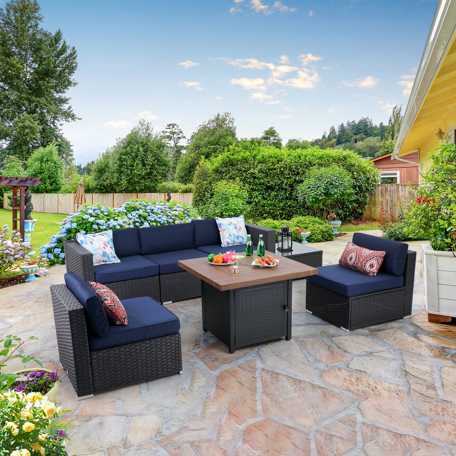 MF Studio 7-Piece 34′ Gas Fire Pit Table Set, 50000 BTU Gas Fire Pit Table with Outdoor Rattan Sectional Sofa Sets Suitable for Garden, Patio, Yard
