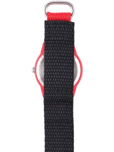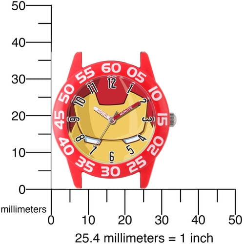 This Marvel’s Avengers: Tony Stark Boys’ Red Plastic Time Teacher Watch features a red hook and loop nylon strap with black backing.