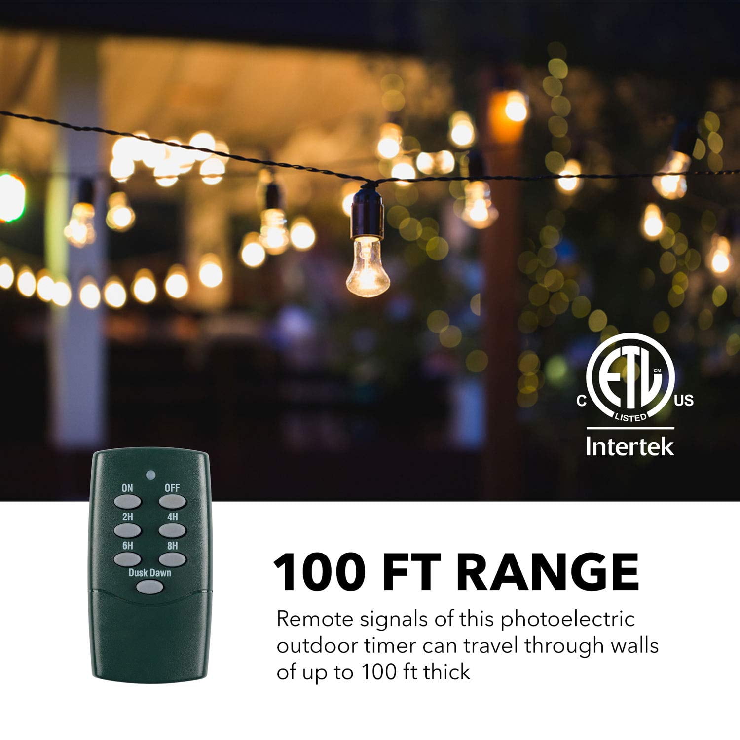 - 【PHOTOCELL WITH REMOTE CONTROL】 Remote signals of this photoelectric outdoor timer can travel through walls of up to 100 ft thick