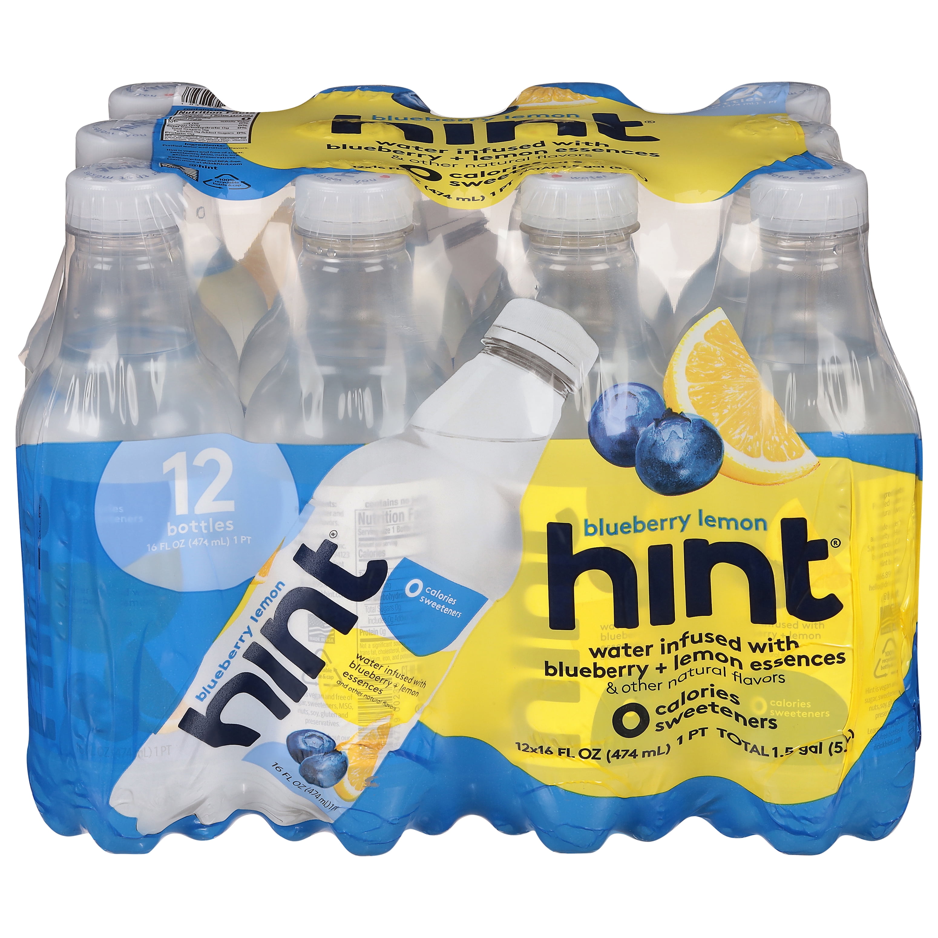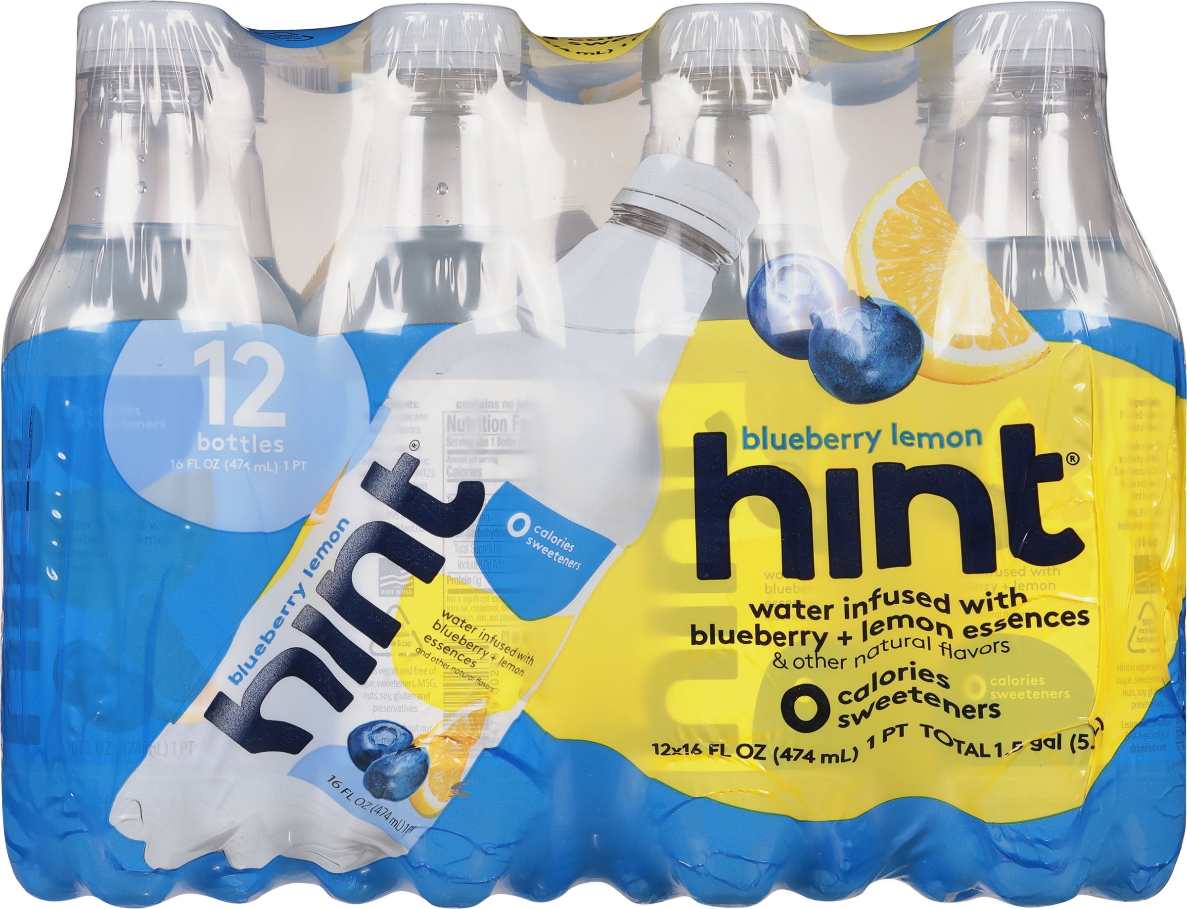 - Water infused with blueberry + lemon essences & other natural flavors. 0 calories; sweeteners. Hint is vegan and free of sugar, sweeteners, MSG, nuts, soy, gluten and preservatives. Non GMO. Certified by NSF. By an independent hint bottler. Hint drink water, not sugar. drinkhint.com. (at)hint. Learn more at drinkhint.com. Learn more about our BPA-free bottles at drinkhint.com. 100% recyclable bottle & cap. 100% recyclable and BPA-free. Made in the USA.